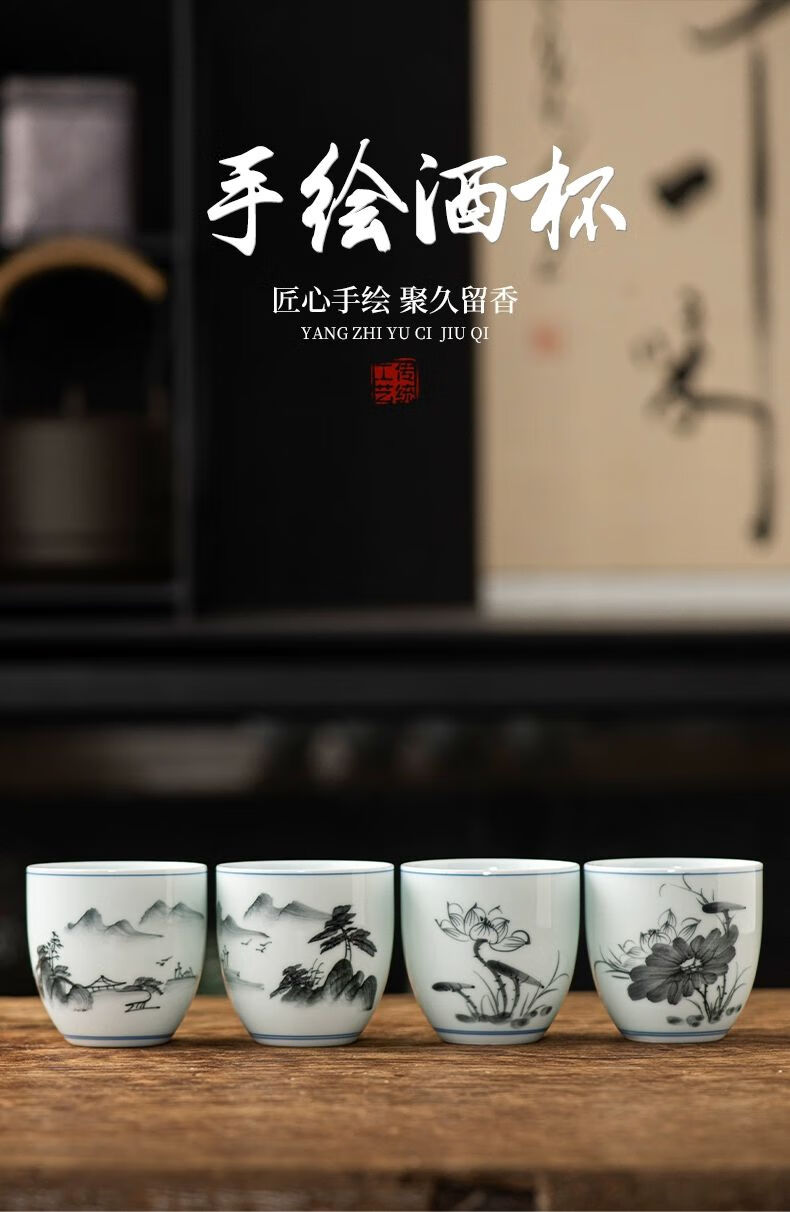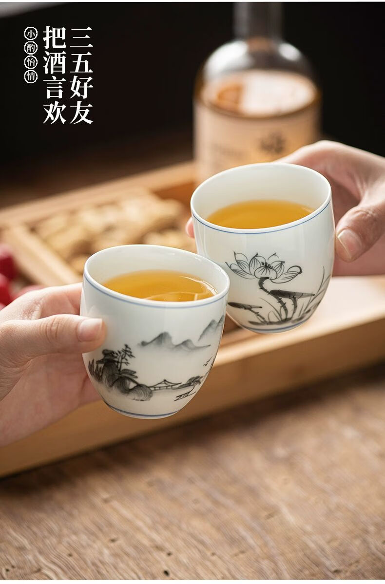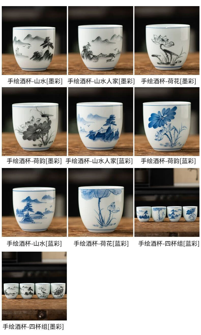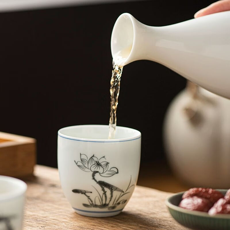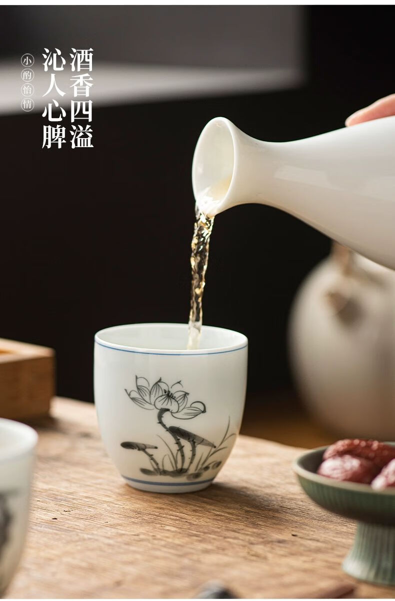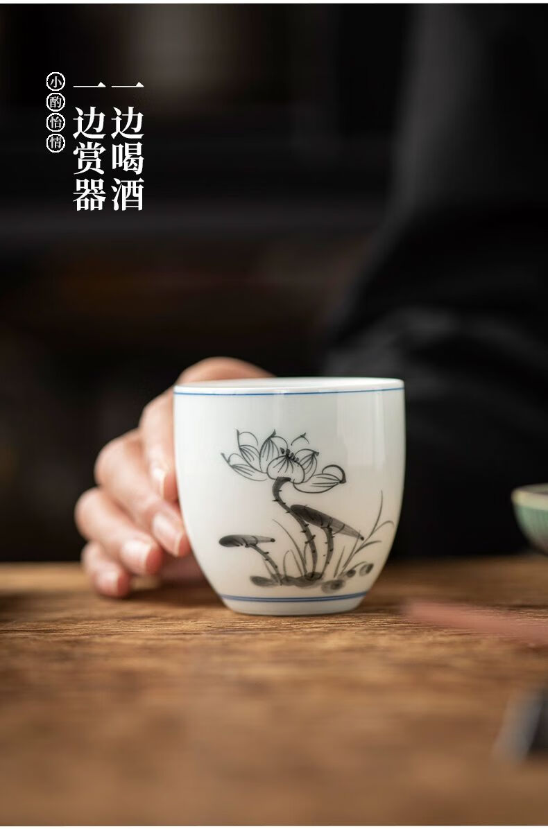 • 商品名称:松韵清中式复古烈酒杯家用陶瓷白酒杯三两酒盅古风果酒杯小酒盏 单个蓝彩荷韵 /个