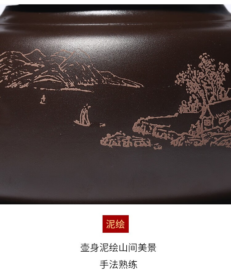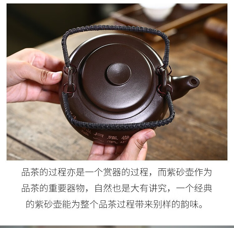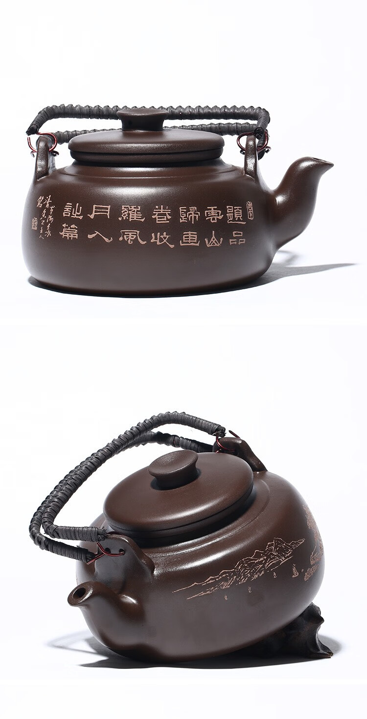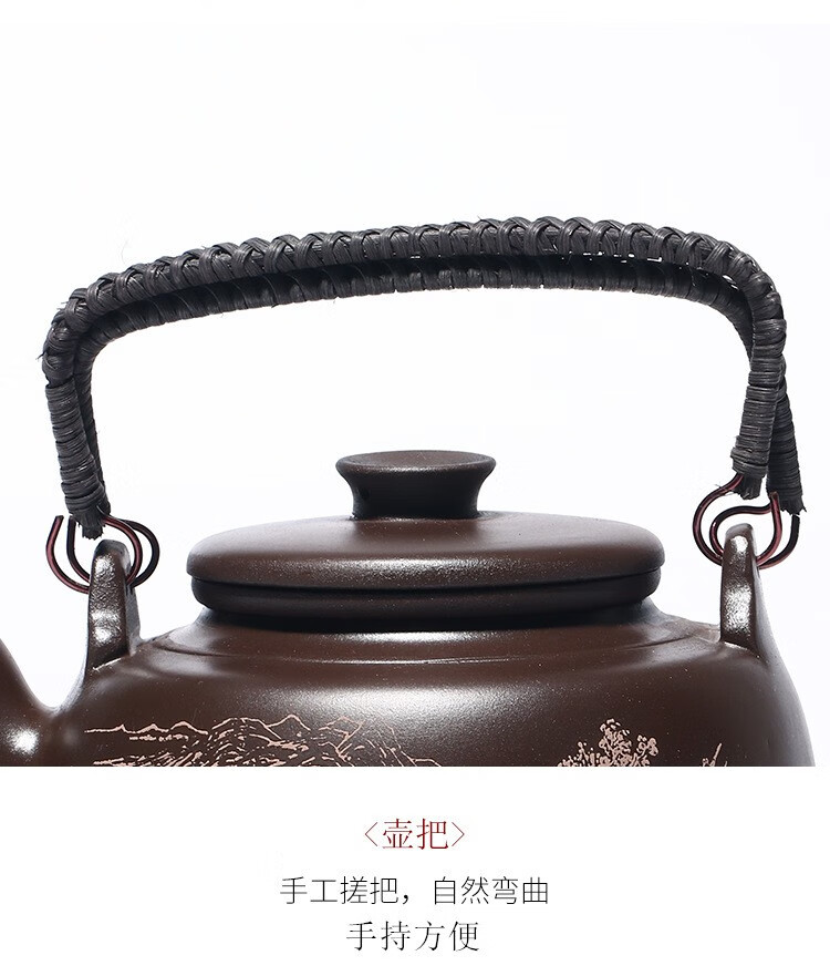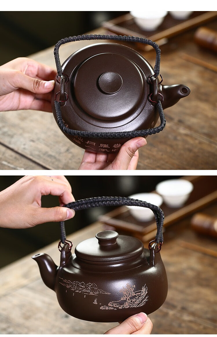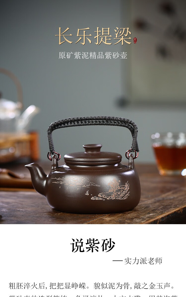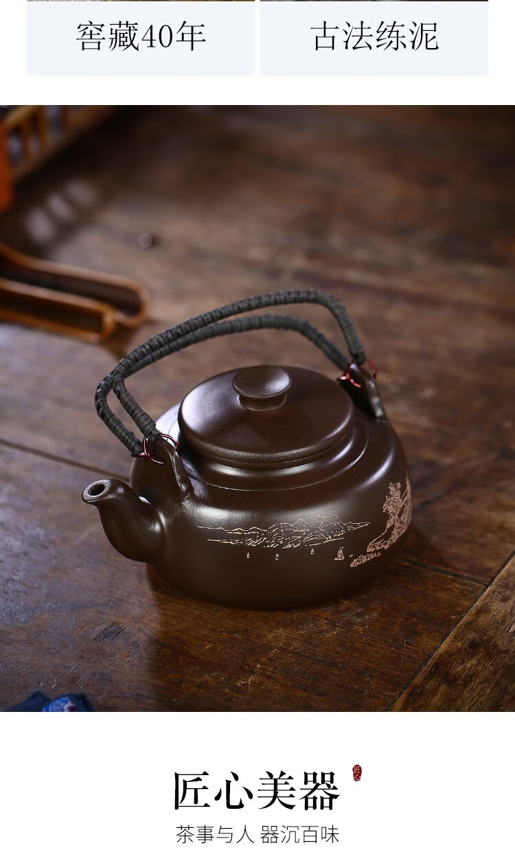 • 商品名称:满庭花宜兴原矿紫泥手工紫砂壶长乐提梁壶手绘山水泡茶手提大容量壶定制 02214/套