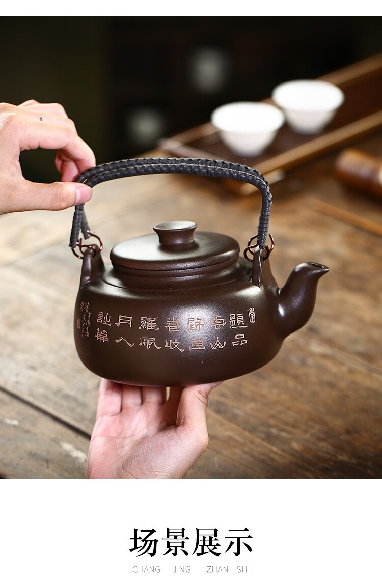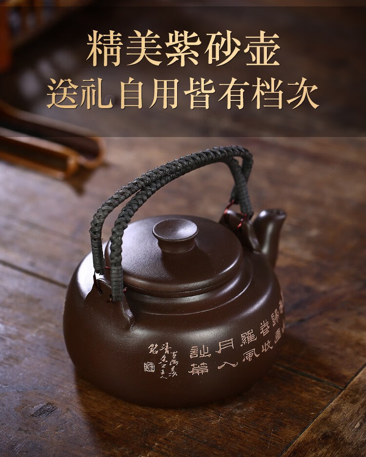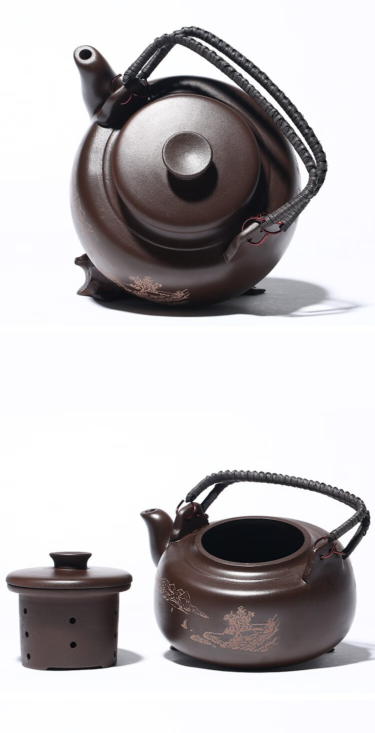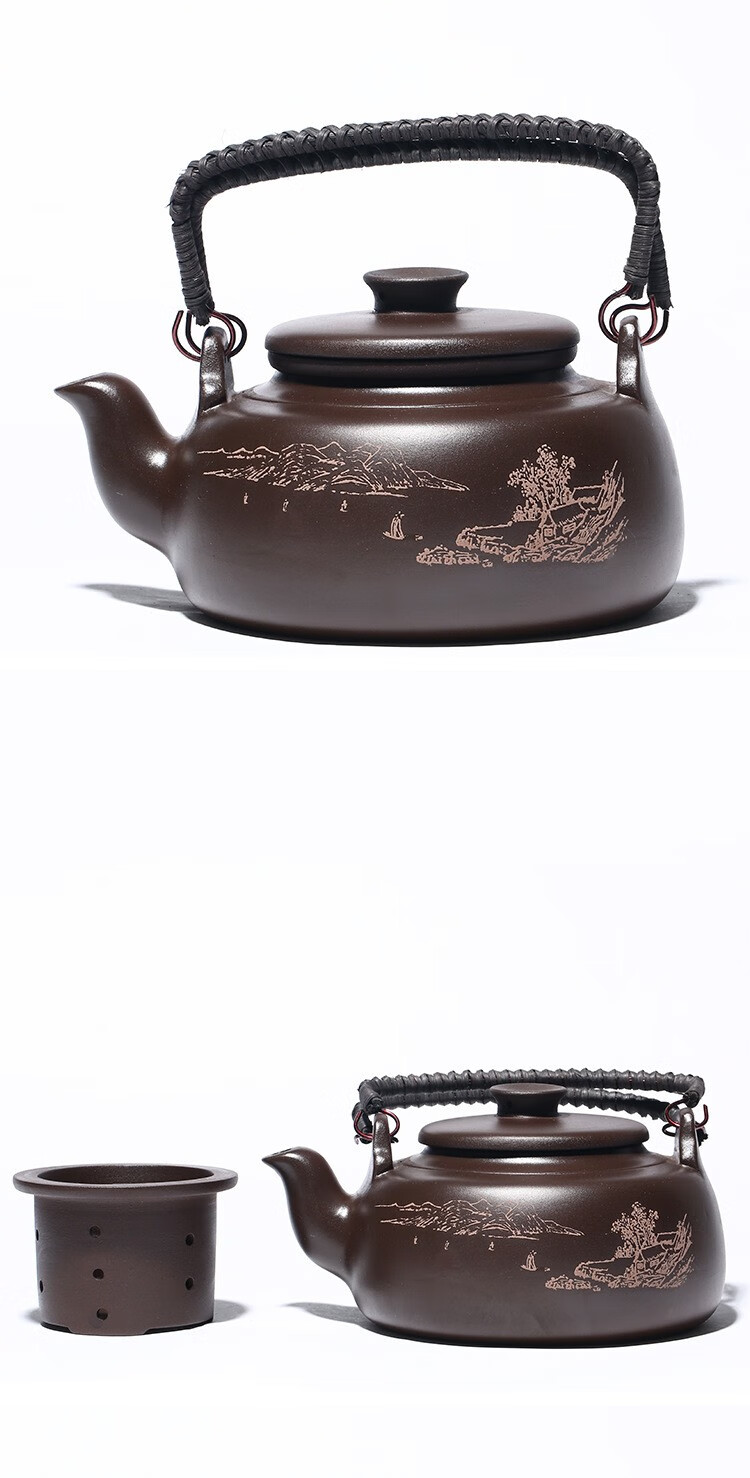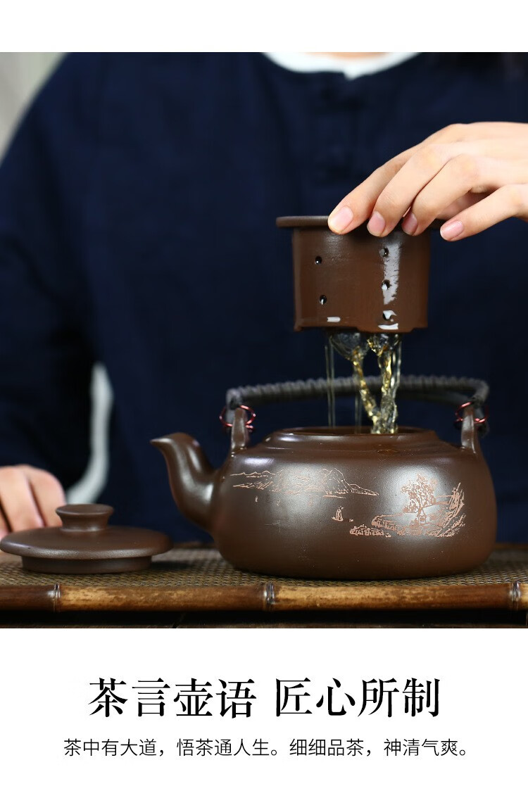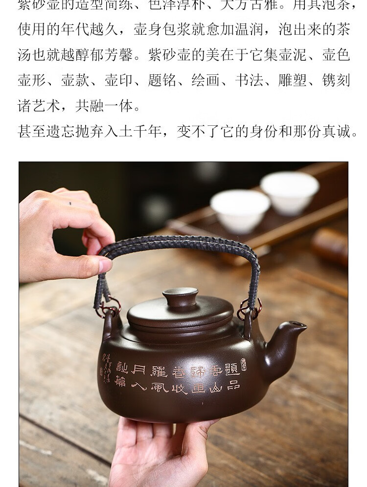 • 商品名称:满庭花宜兴原矿紫泥手工紫砂壶长乐提梁壶手绘山水泡茶手提大容量壶定制 02214/套
