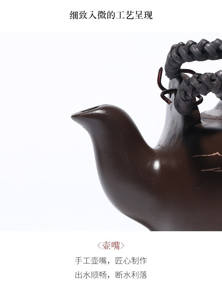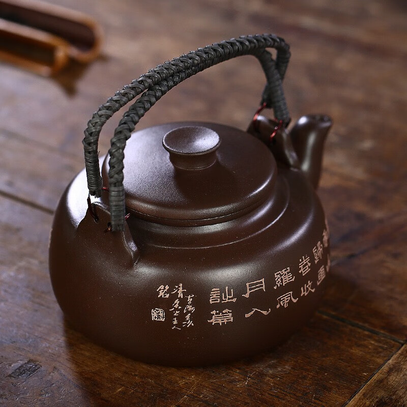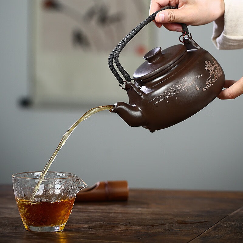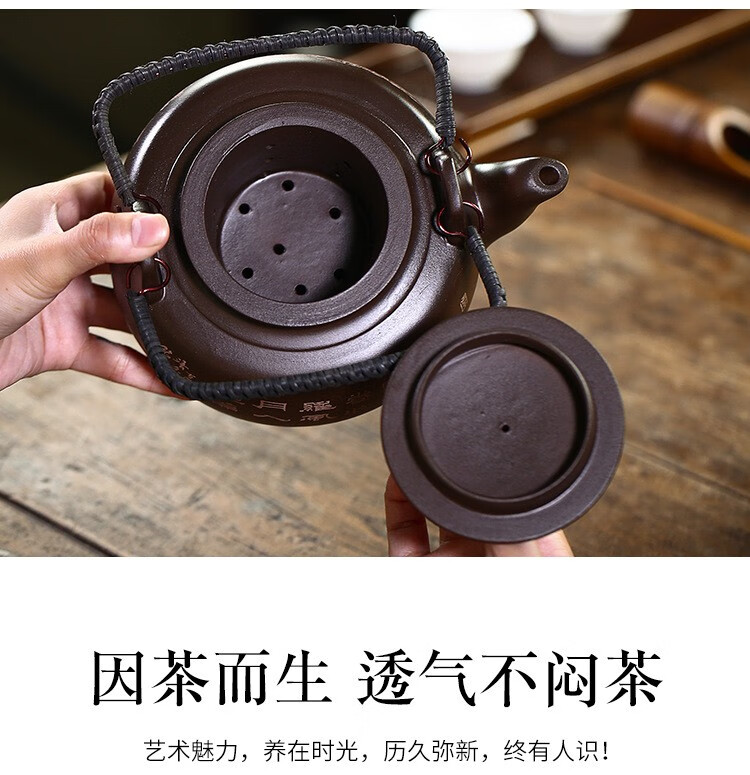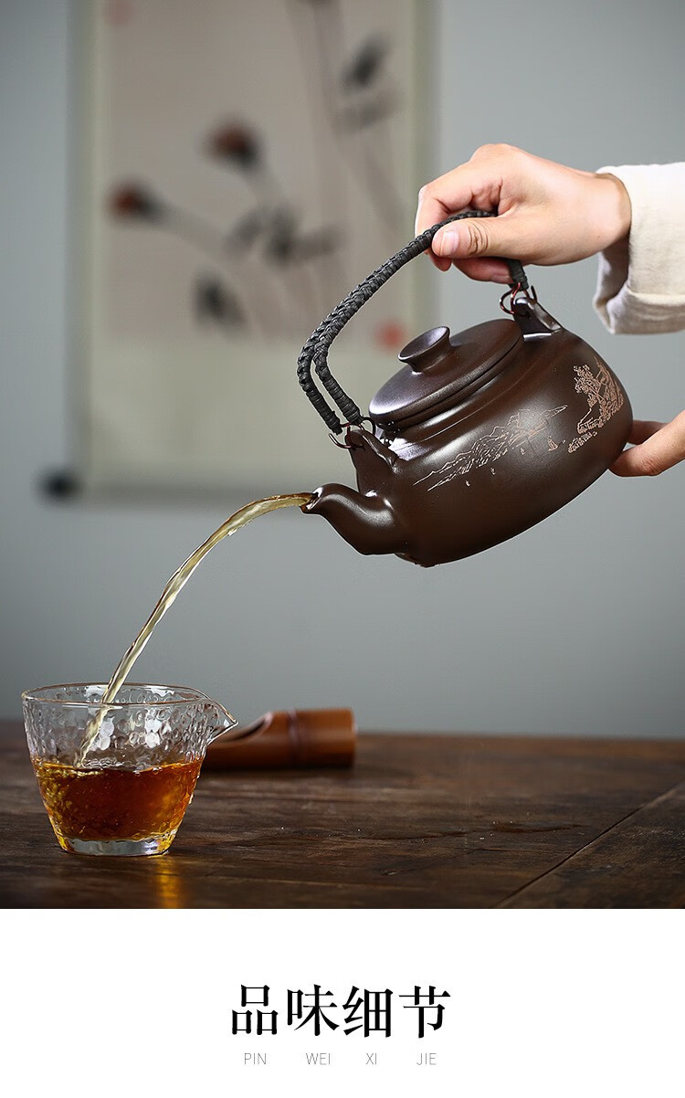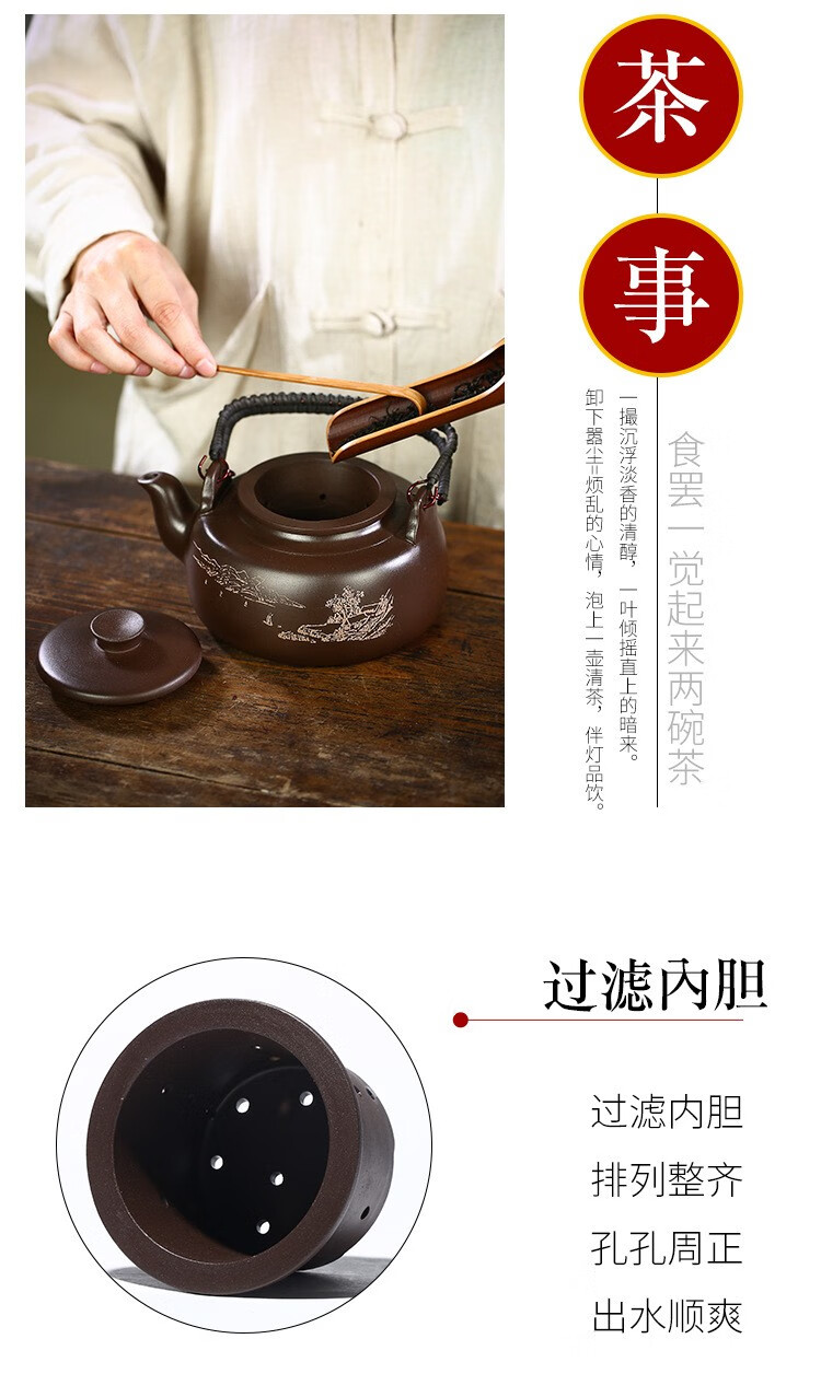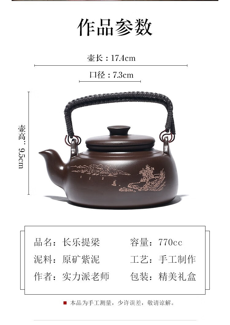 • 商品名称:满庭花宜兴原矿紫泥手工紫砂壶长乐提梁壶手绘山水泡茶手提大容量壶定制 02214/套