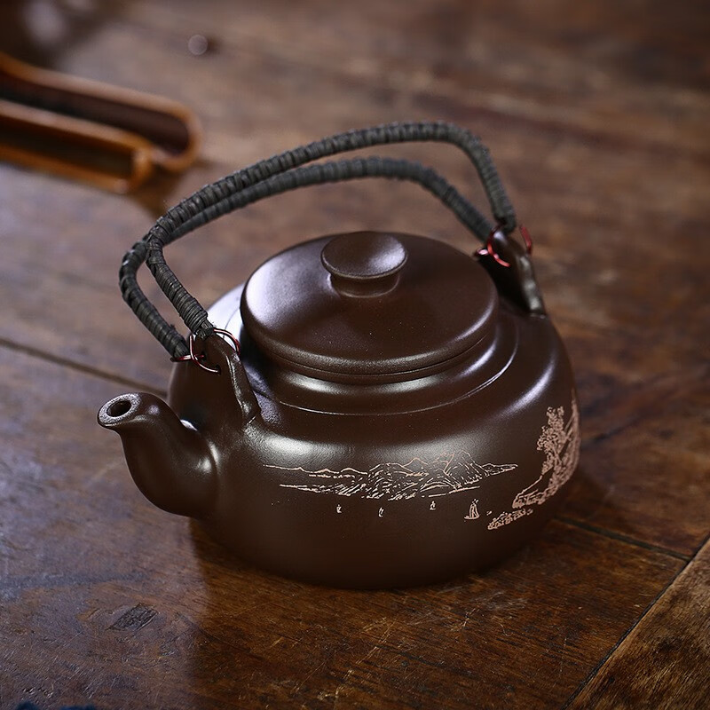 厨具  > 茶具  > 茶壶  >  满庭花  >  满庭花宜兴原矿紫泥手工紫砂壶长乐提梁壶手绘山水泡茶手提大容量壶定制 02214/套