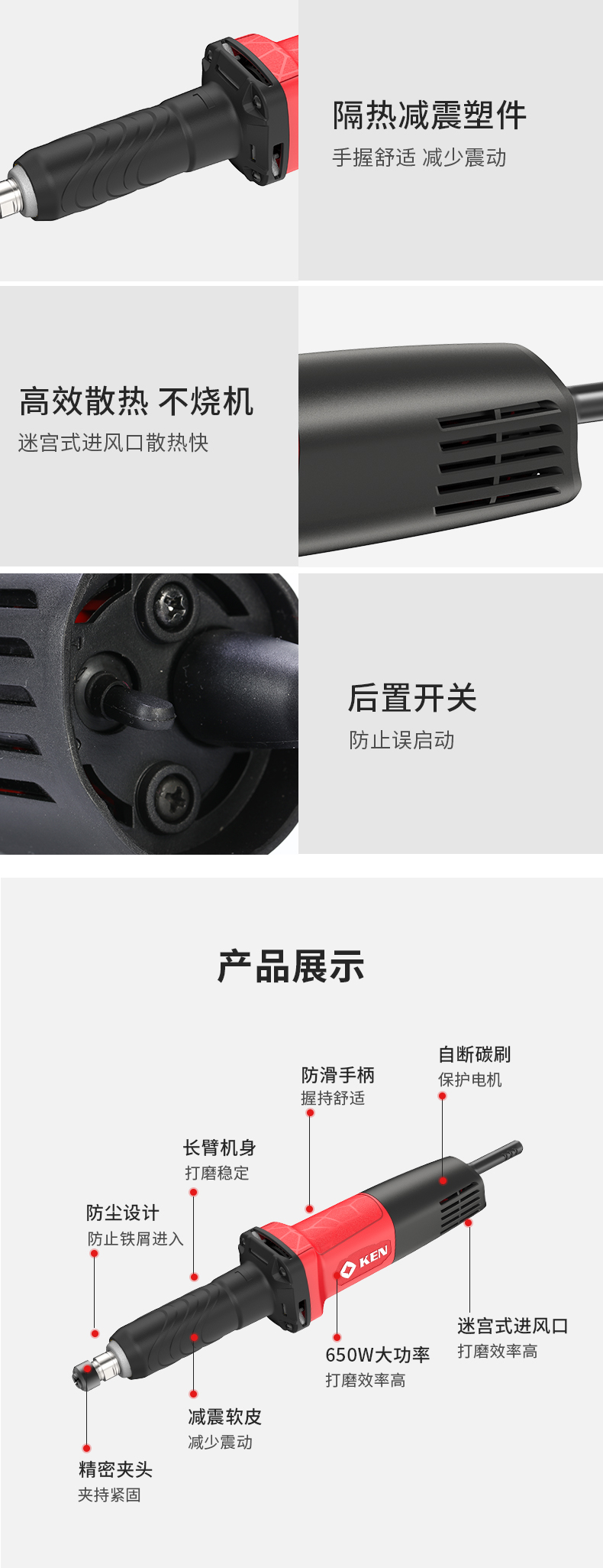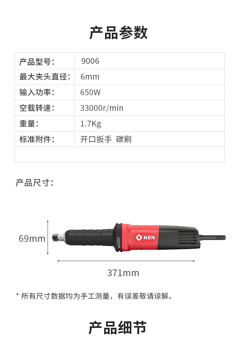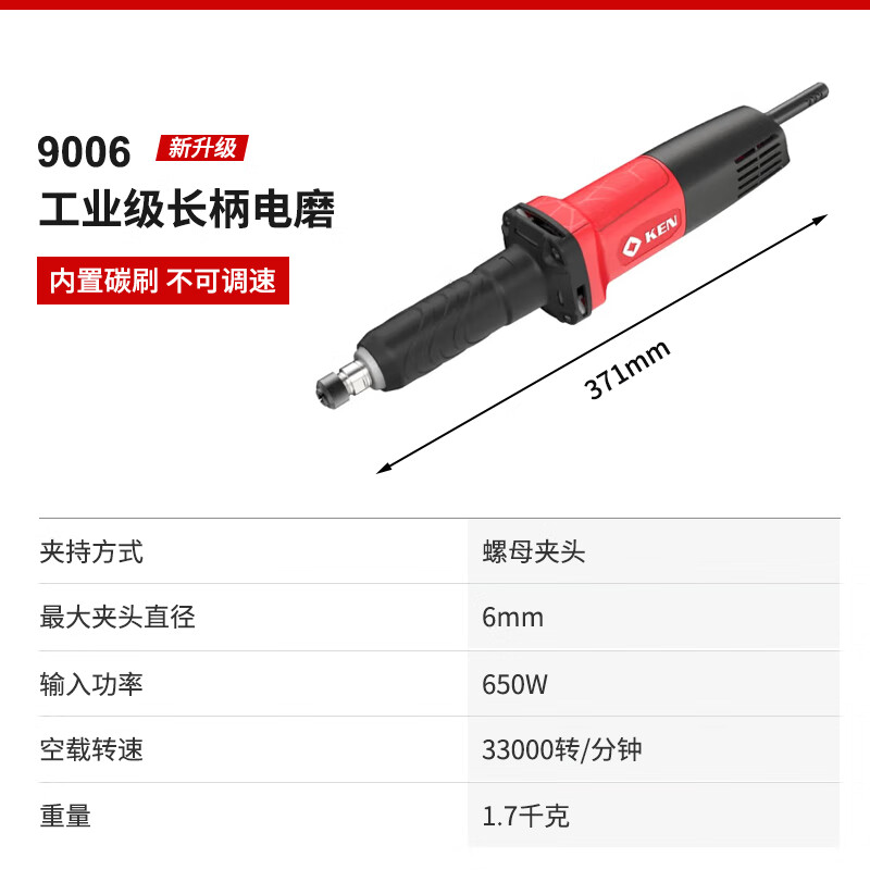 • 商品名称:锐奇(KEN)电磨机9006直磨机打磨机650W6mm夹头内孔抛光机雕刻机电动工具 9006/台