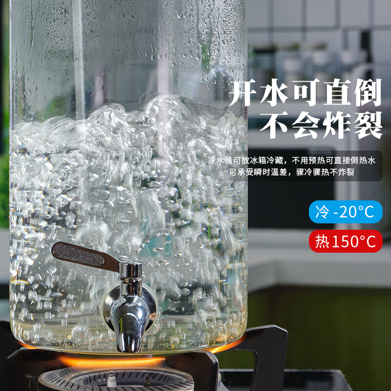 • 商品名称:丹诗致远 耐高温玻璃冷水壶带龙头商用大容量柠檬饮料可乐果汁桶家用凉水壶 15升高档底座不锈钢龙头 15升高档底座不锈钢龙头/个