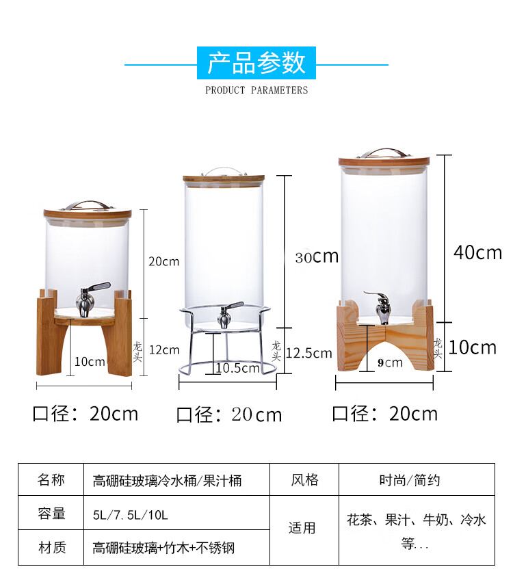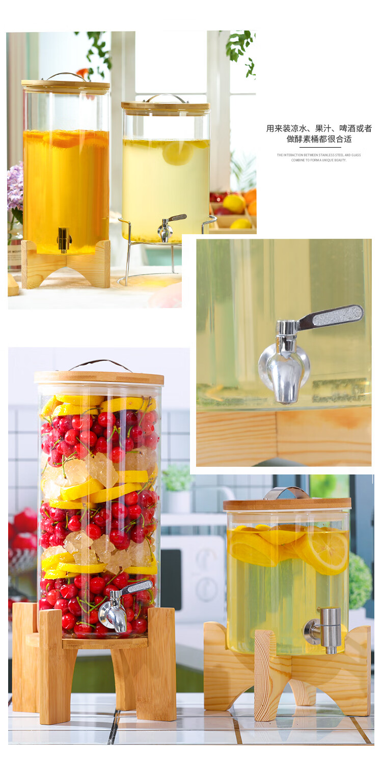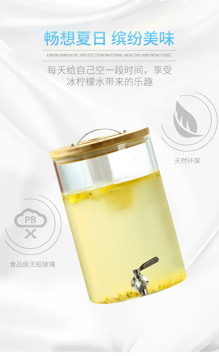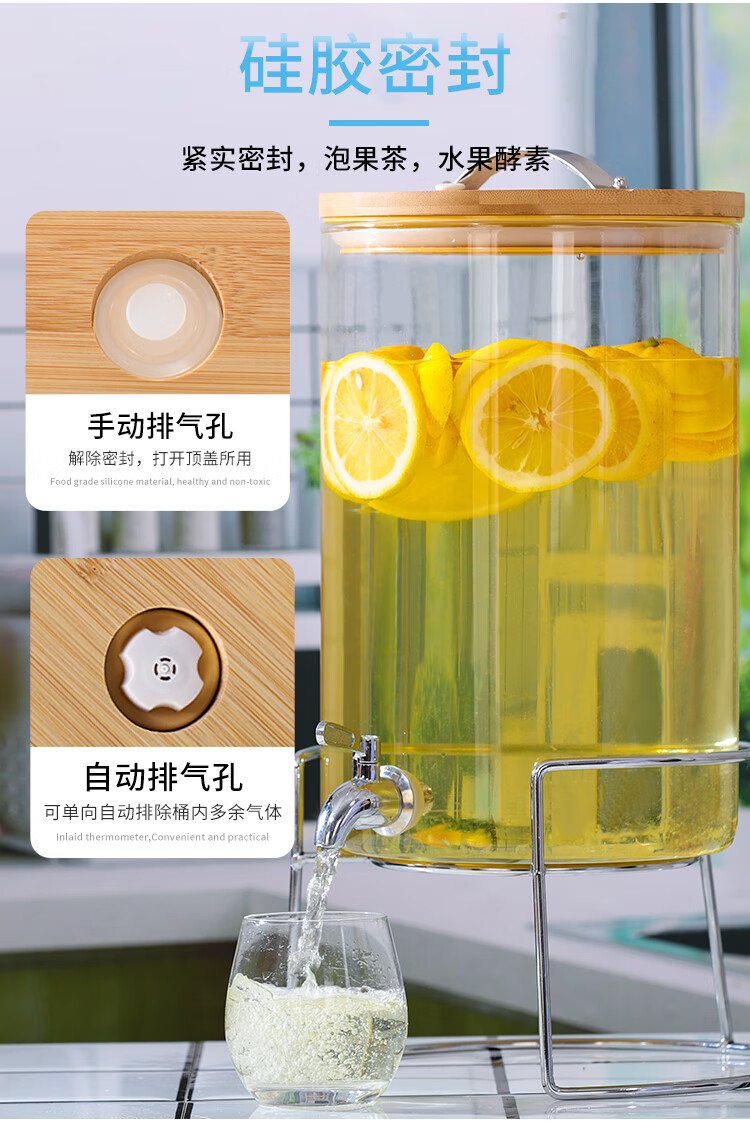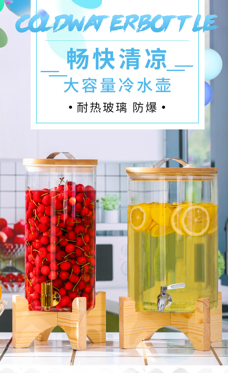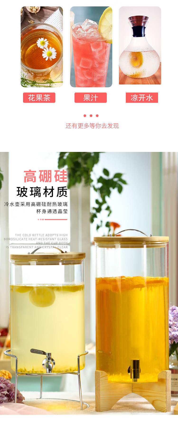 商品名称: 丹诗致远 耐高温玻璃冷水壶带龙头商用大容量柠檬饮料可乐果汁桶家用凉水壶 15升高档底座不锈钢龙头 15升高档底座不锈钢龙头/个