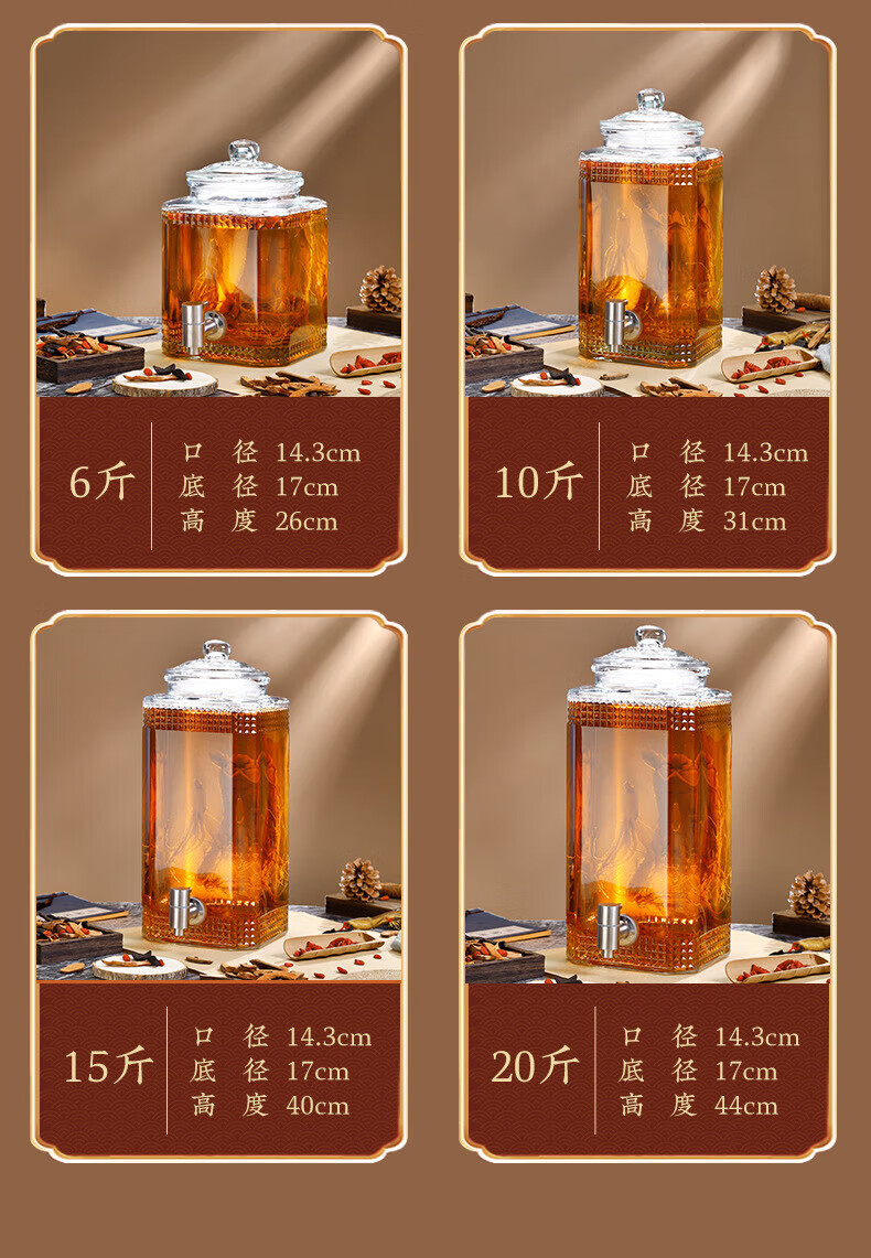 • 商品名称:蔚毅 泡酒玻璃瓶酿酒坛酒罐加厚家用装酒容器 铜龙头+底座 20斤 铜龙头+底座 20斤/个