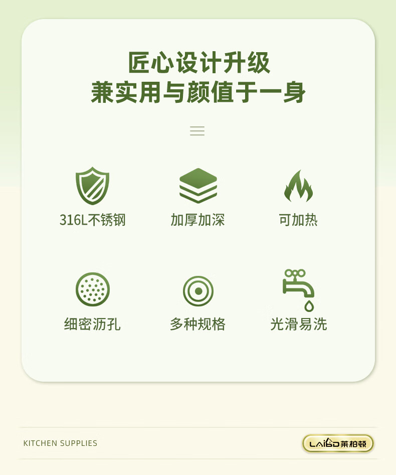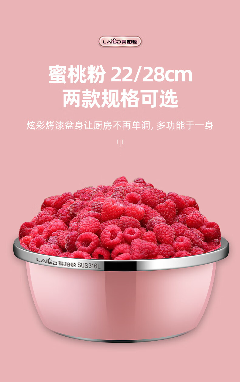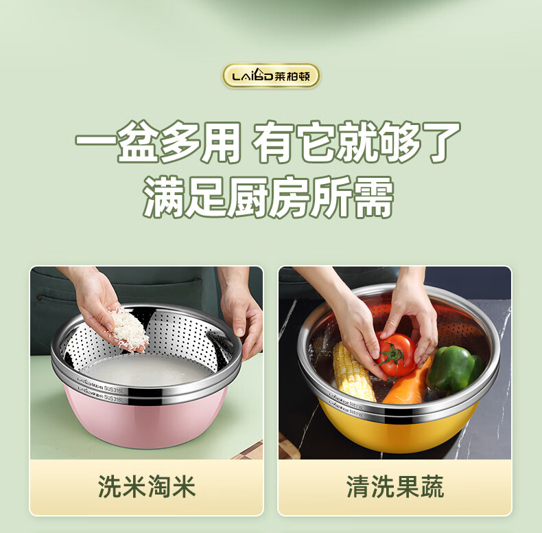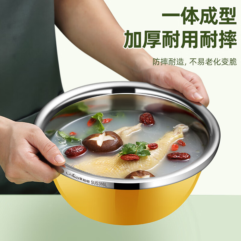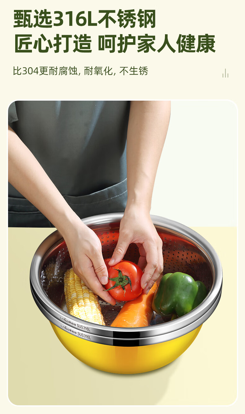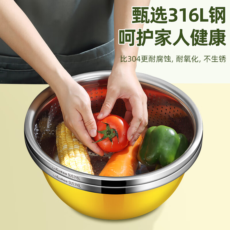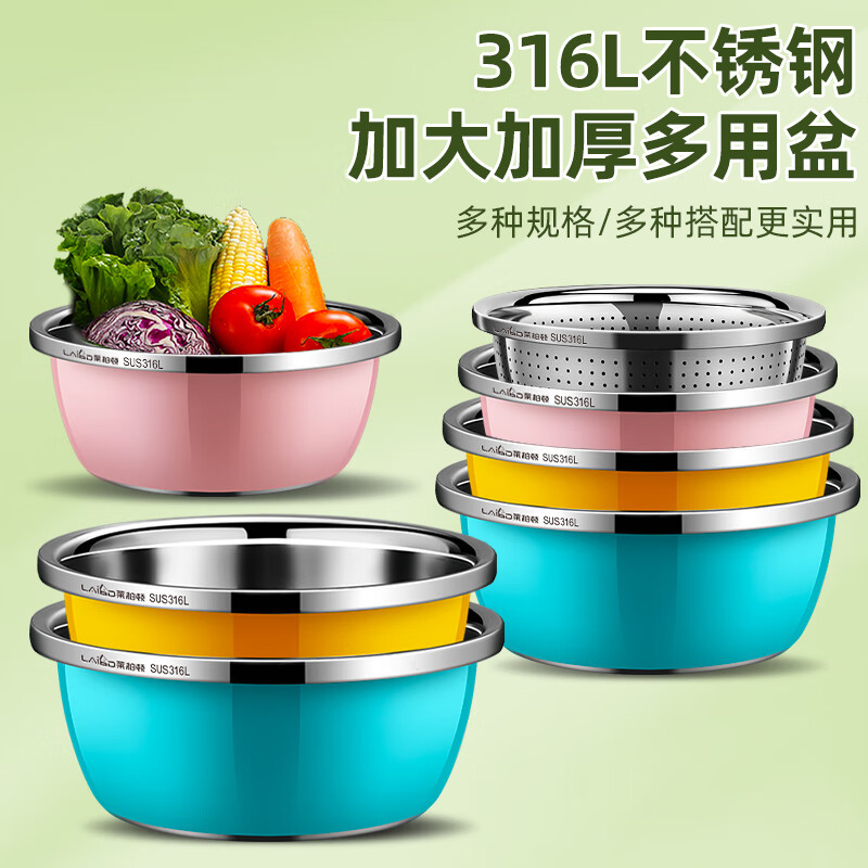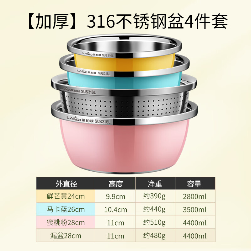 厨具  > 厨房储物  > 厨房储物器皿  >  莱柏顿  >  莱柏顿316L不锈钢盆加厚汤盆洗奶瓶盆洗菜盆水果沥水篮打蛋盆调料盆4件 盆黄24/蓝26/粉28cm+漏28cm-4件套/只