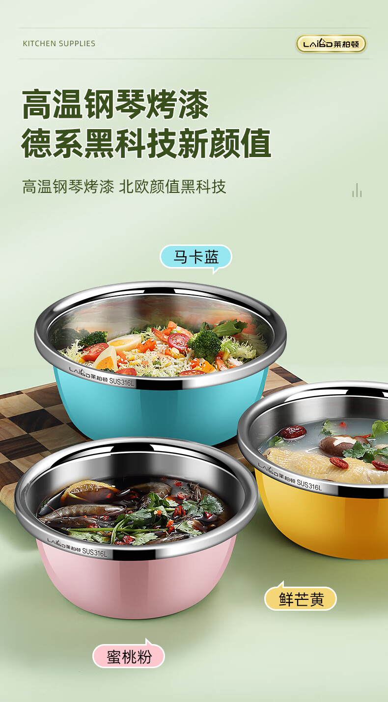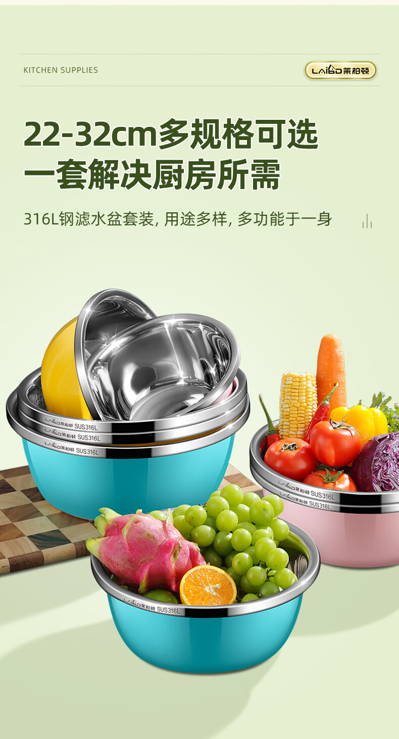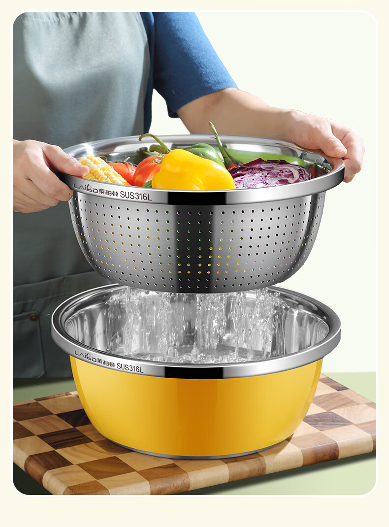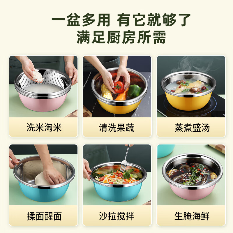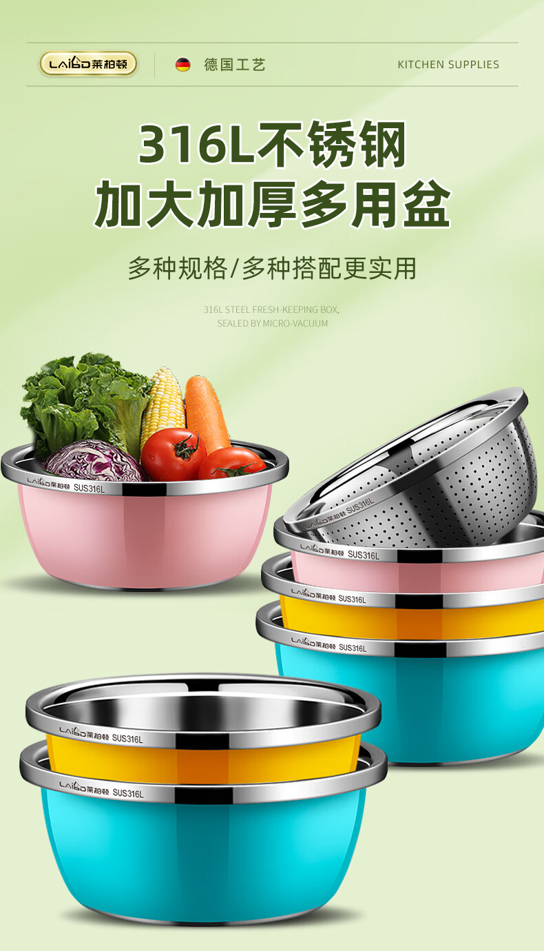 • 商品名称:莱柏顿316L不锈钢盆加厚汤盆洗奶瓶盆洗菜盆水果沥水篮打蛋盆调料盆4件 盆黄24/蓝26/粉28cm+漏28cm-4件套/只