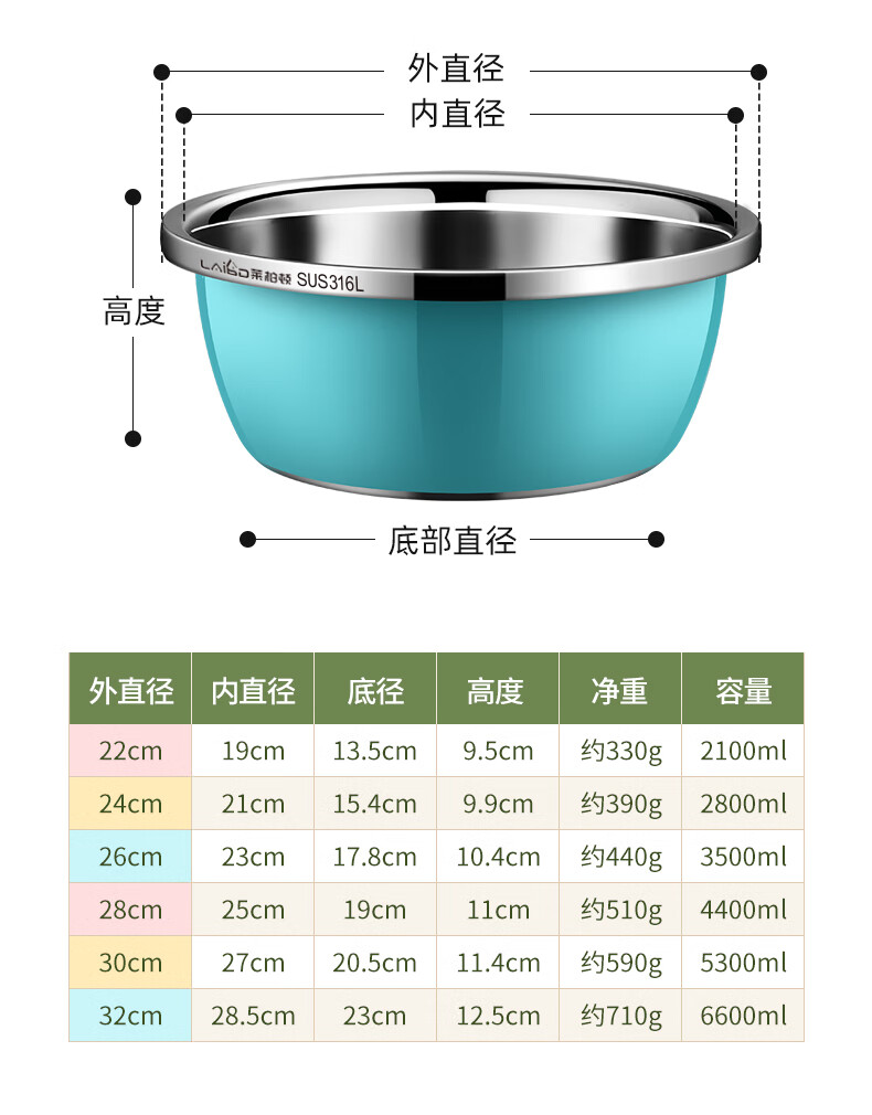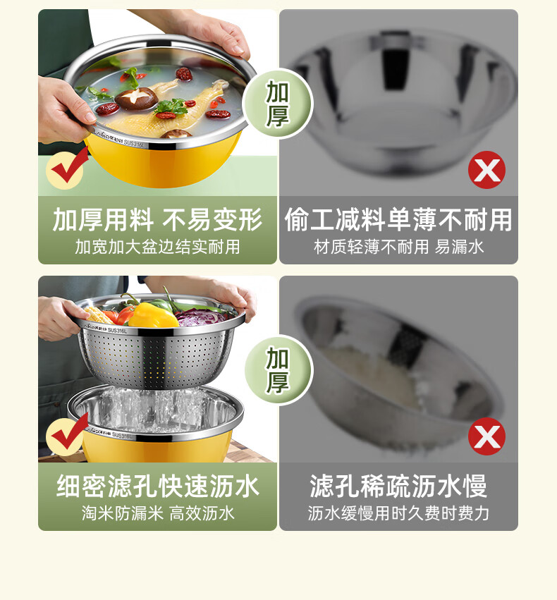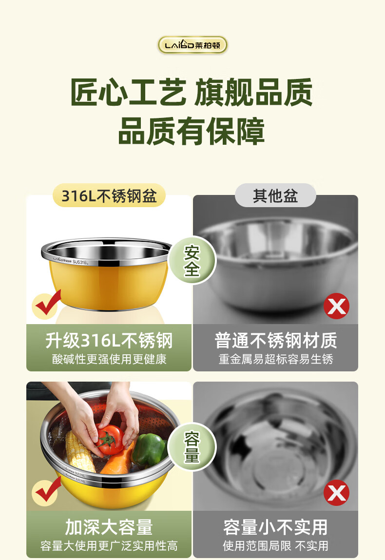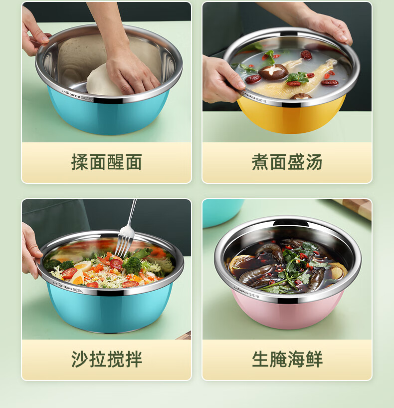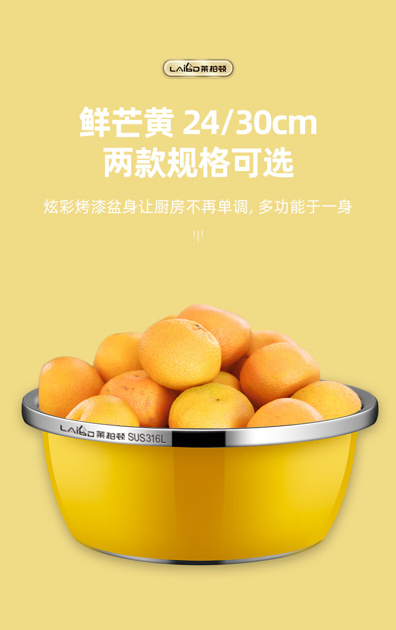 • 商品名称:莱柏顿316L不锈钢盆加厚汤盆洗奶瓶盆洗菜盆水果沥水篮打蛋盆调料盆4件 盆黄24/蓝26/粉28cm+漏28cm-4件套/只