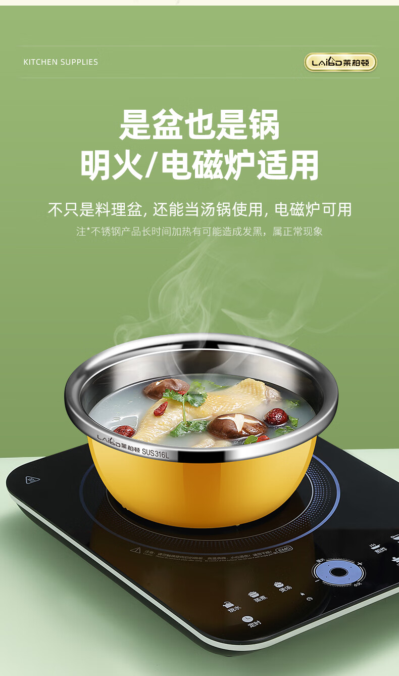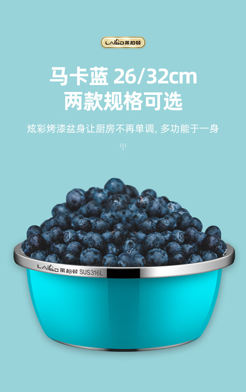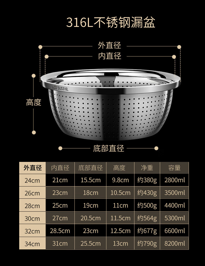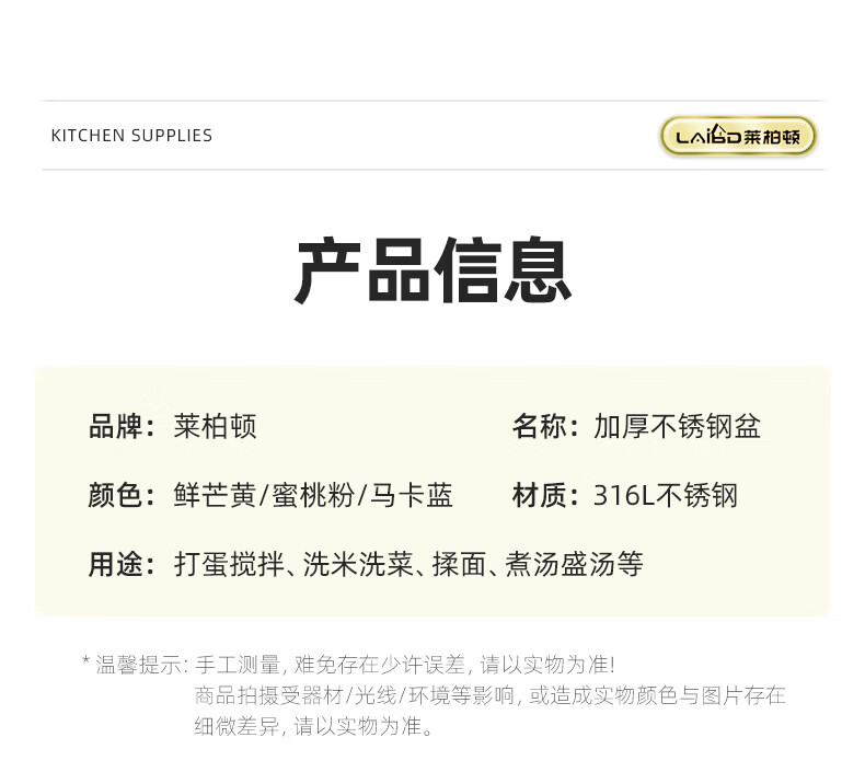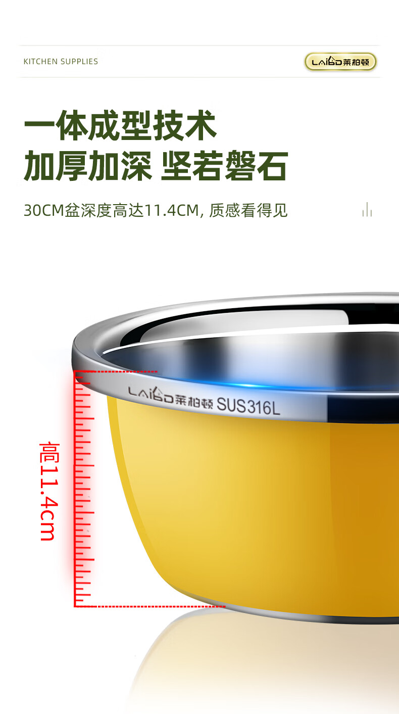 • 商品名称:莱柏顿316L不锈钢盆加厚汤盆洗奶瓶盆洗菜盆水果沥水篮打蛋盆调料盆4件 盆黄24/蓝26/粉28cm+漏28cm-4件套/只
