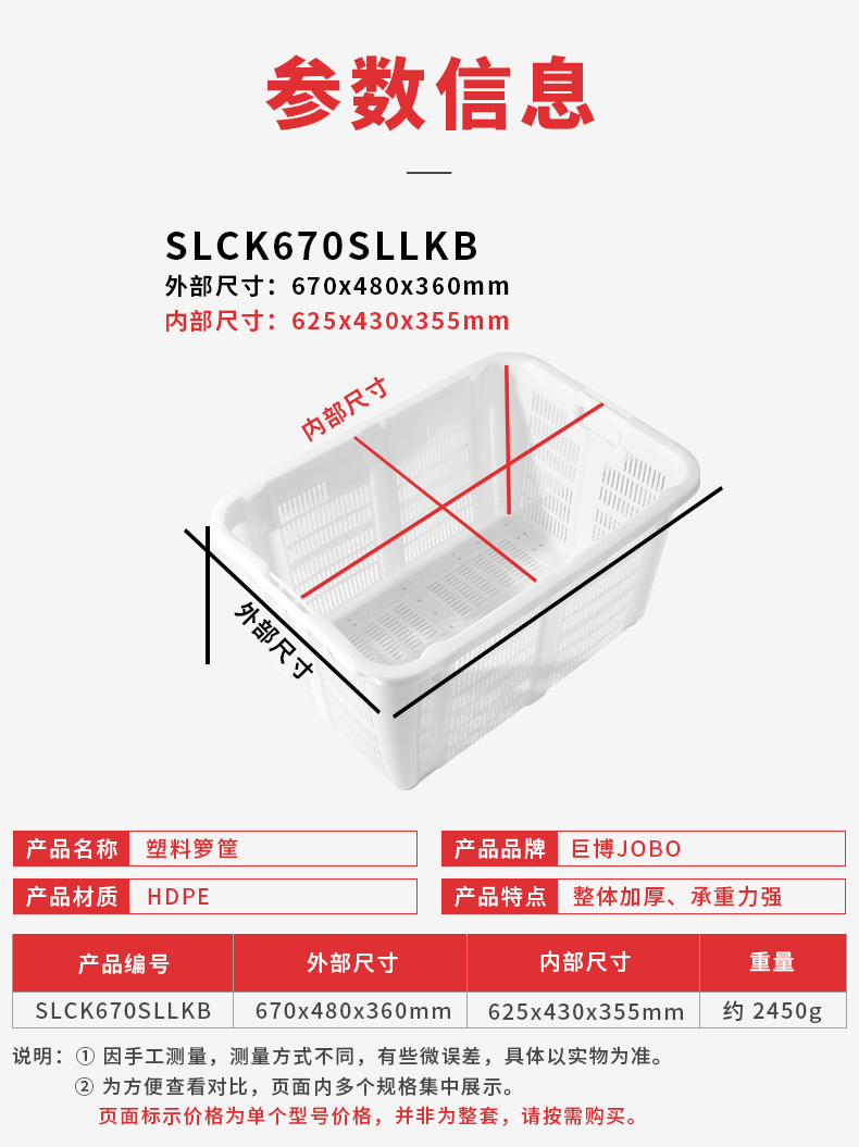 • 商品名称:巨博(JOBO)商用厨房储物收纳筐白色 塑料水果蔬菜周转篮箩筐67x48x36cm 商用厨房储物收纳筐白色/个
