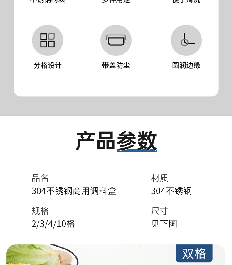 • 商品名称:Edo304不锈钢商用高档全钢调味盒 酒店餐厅调料储物盒2格+2勺带盖 1/个