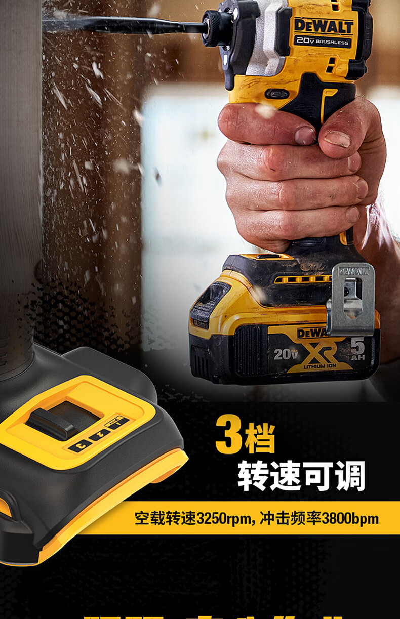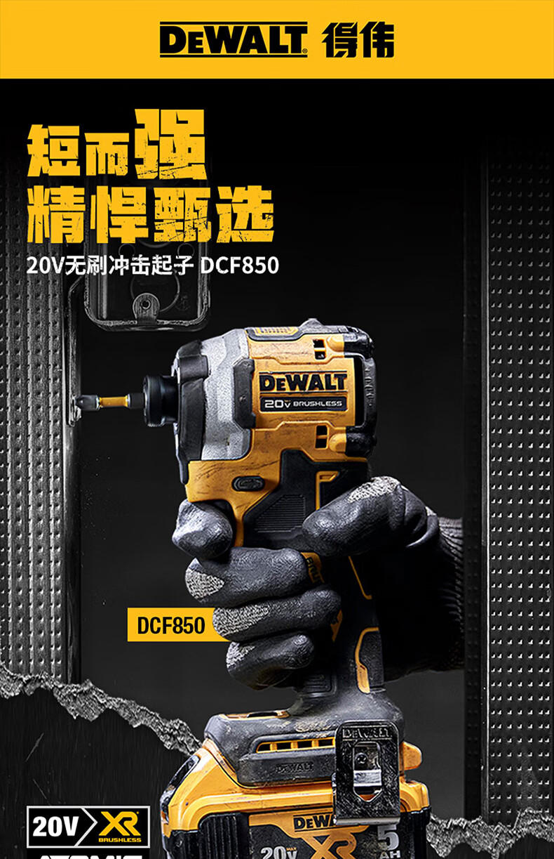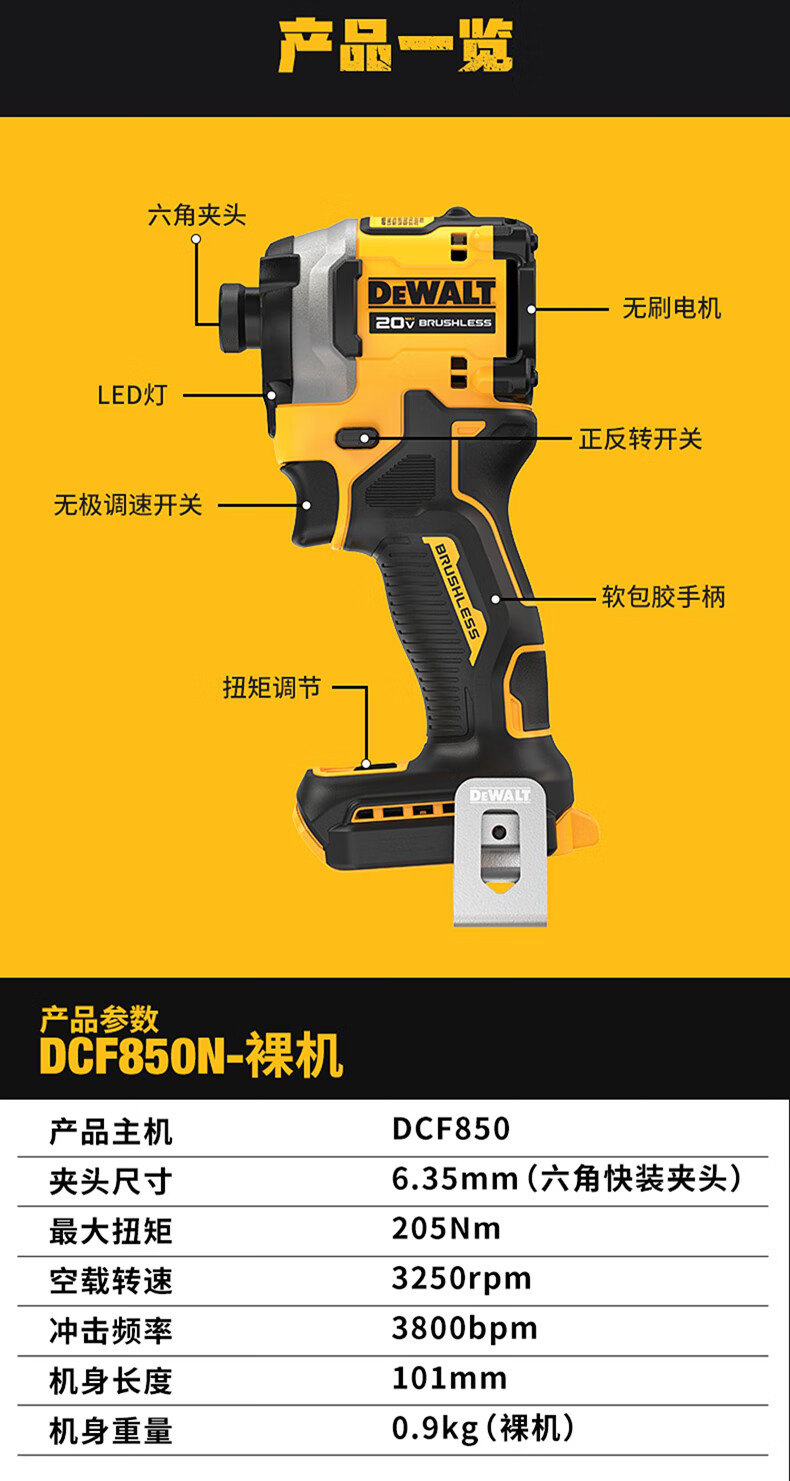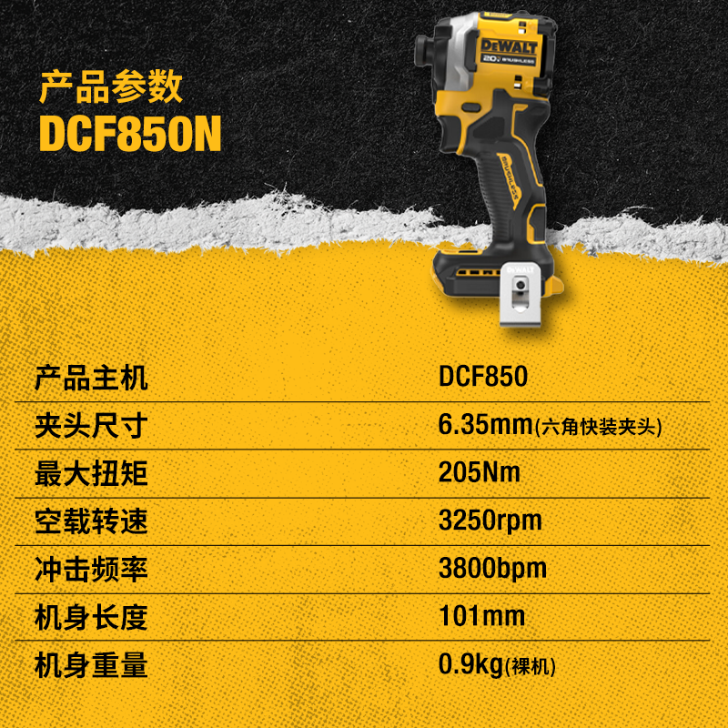 商品名称: 得伟(DEWALT)20V无线锂电无刷冲击起子电钻单机205Nm超大扭矩DCF850N-A9 DCF850N-A9/件