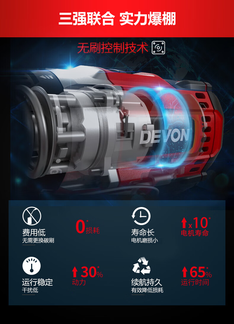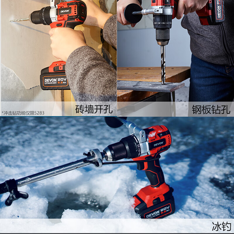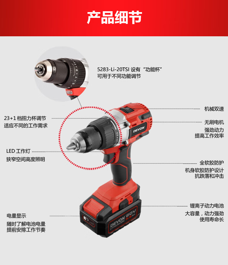 • 商品名称:大有(Devon) 20V工业级无刷锂电钻冲击钻5283充电手电钻起子机120牛裸机 5283-Li-20TSI/N/台