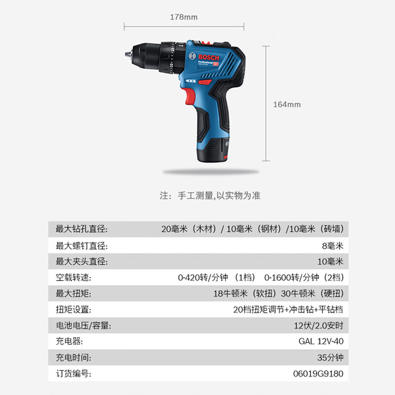商品名称: 博世(BOSCH)冲击钻电动螺丝刀手电钻木材钢材金属钻孔GSB 12V-30 12V锂电双电 GSB 12V-30/台