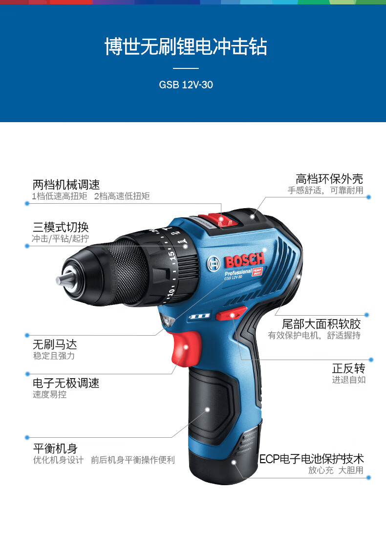 • 商品名称:博世(BOSCH)冲击钻电动螺丝刀手电钻木材钢材金属钻孔GSB 12V-30 12V锂电双电 GSB 12V-30/台