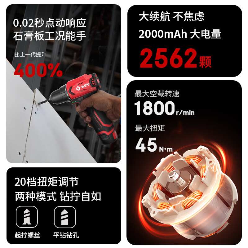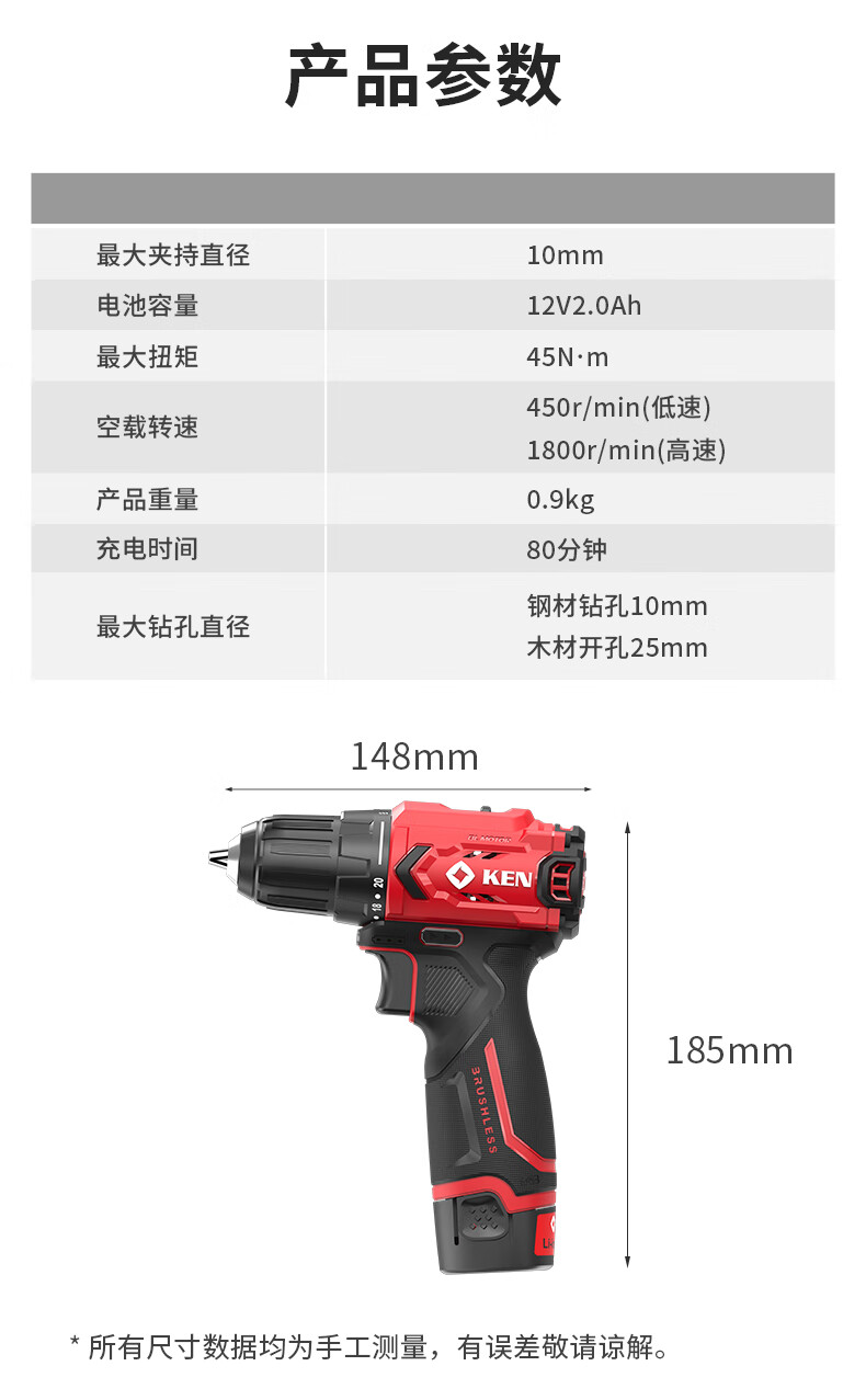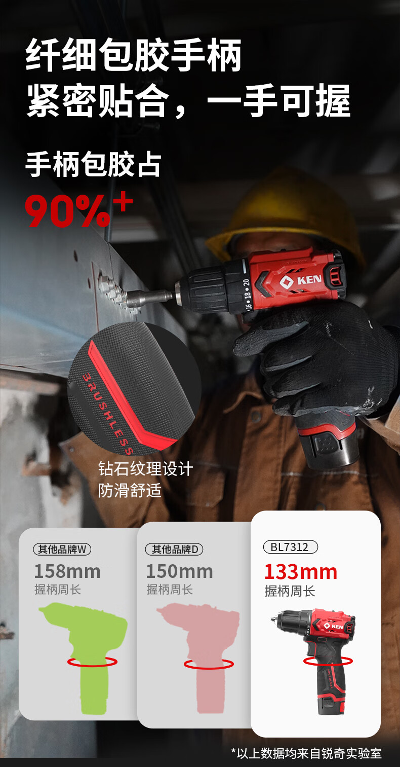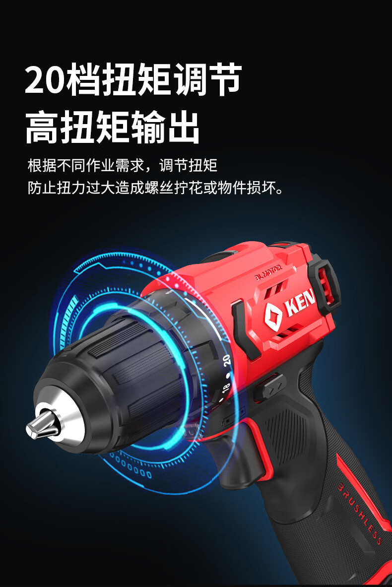 • 商品名称:锐奇(KEN)锂电钻无刷手电钻充电钻家用12V螺丝刀起子BL7312-2双电电动工具 7312/套