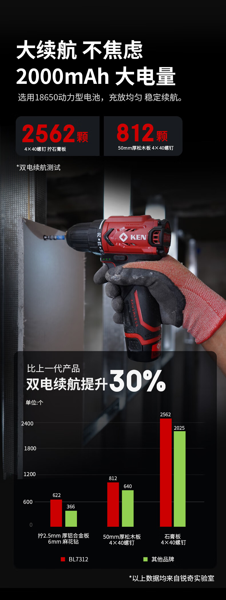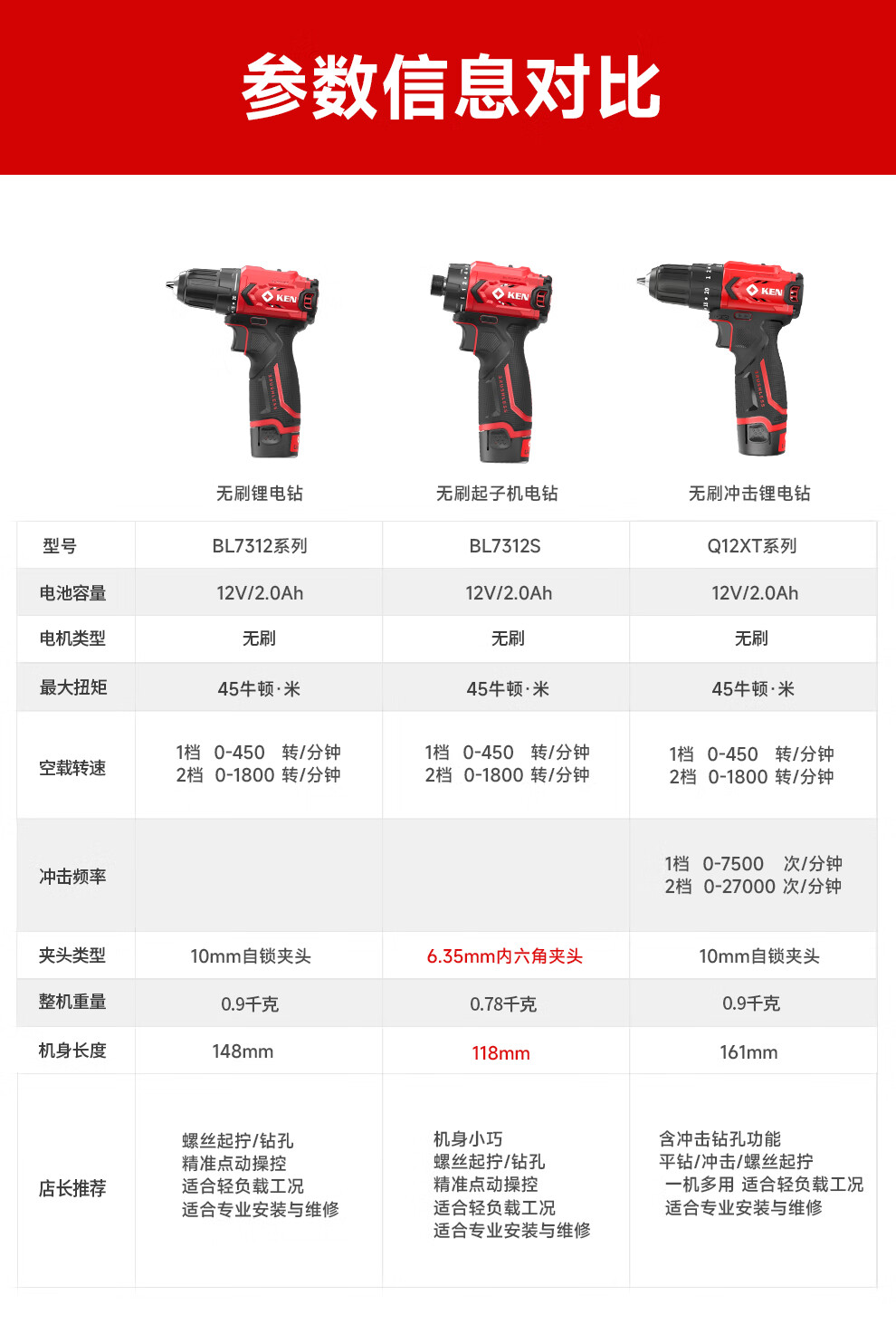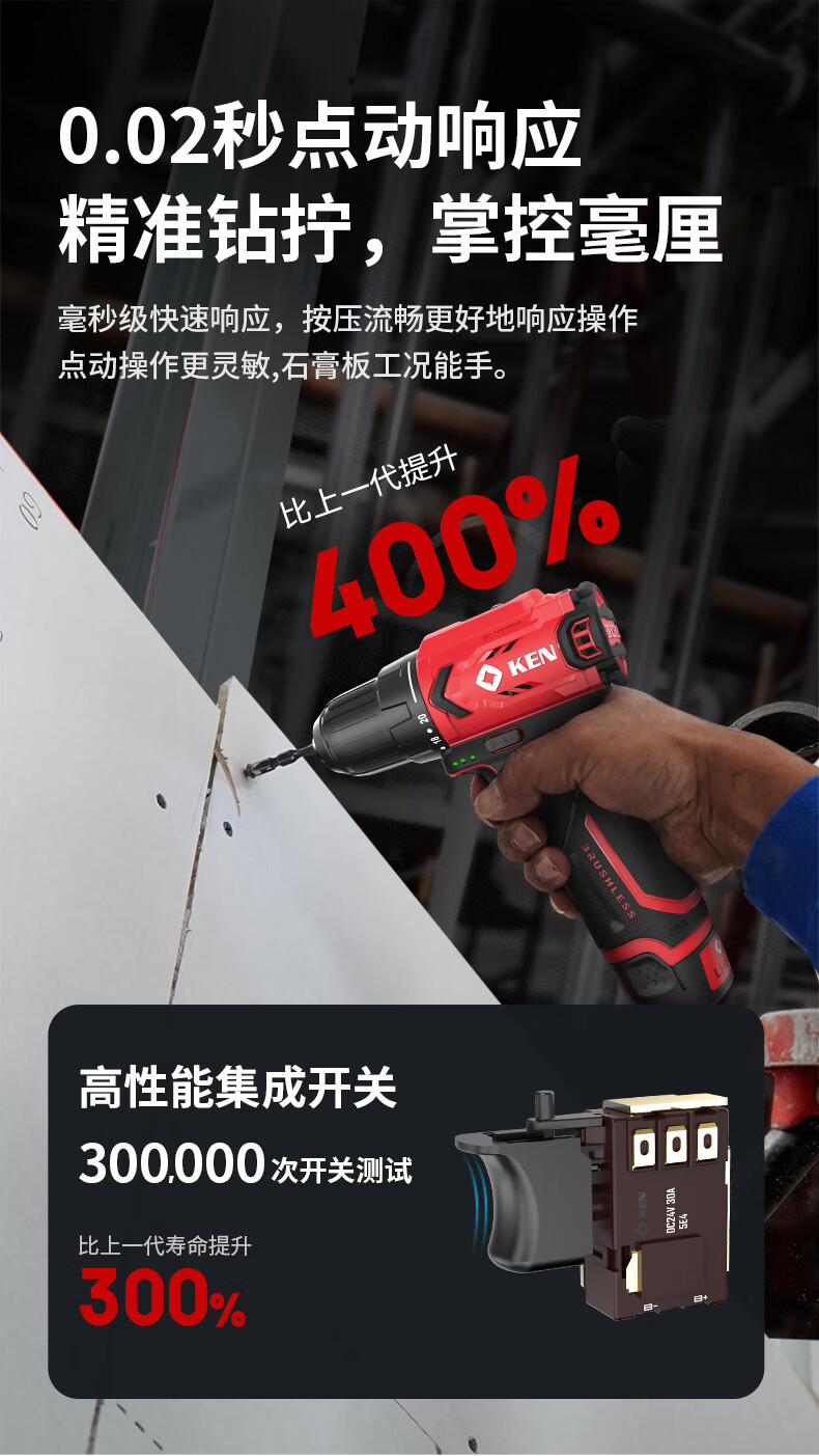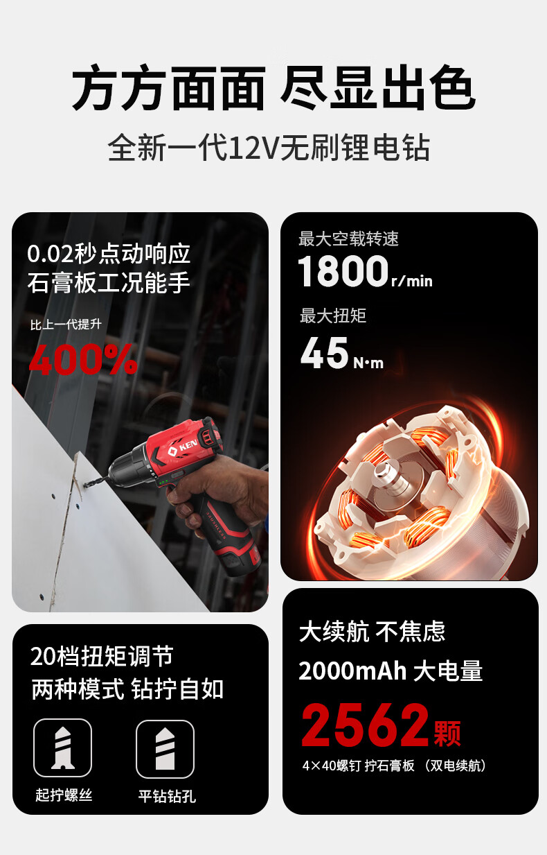 • 商品名称:锐奇(KEN)锂电钻无刷手电钻充电钻家用12V螺丝刀起子BL7312-2双电电动工具 7312/套