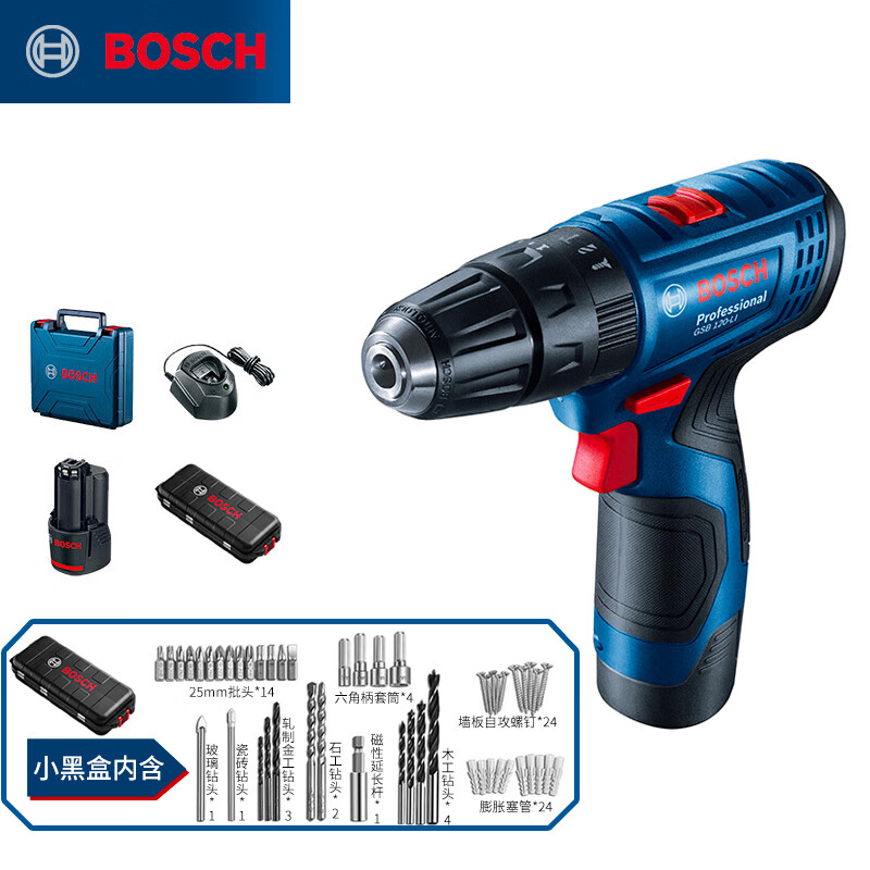 五金/工具  > 电动工具  > 电钻  >  博世/BOSCH  >  博世(BOSCH)电钻钻墙打孔多功能家用螺丝刀GSB120单电12V锂电+小黑盒附件箱 GSB 120 单电促销版/套