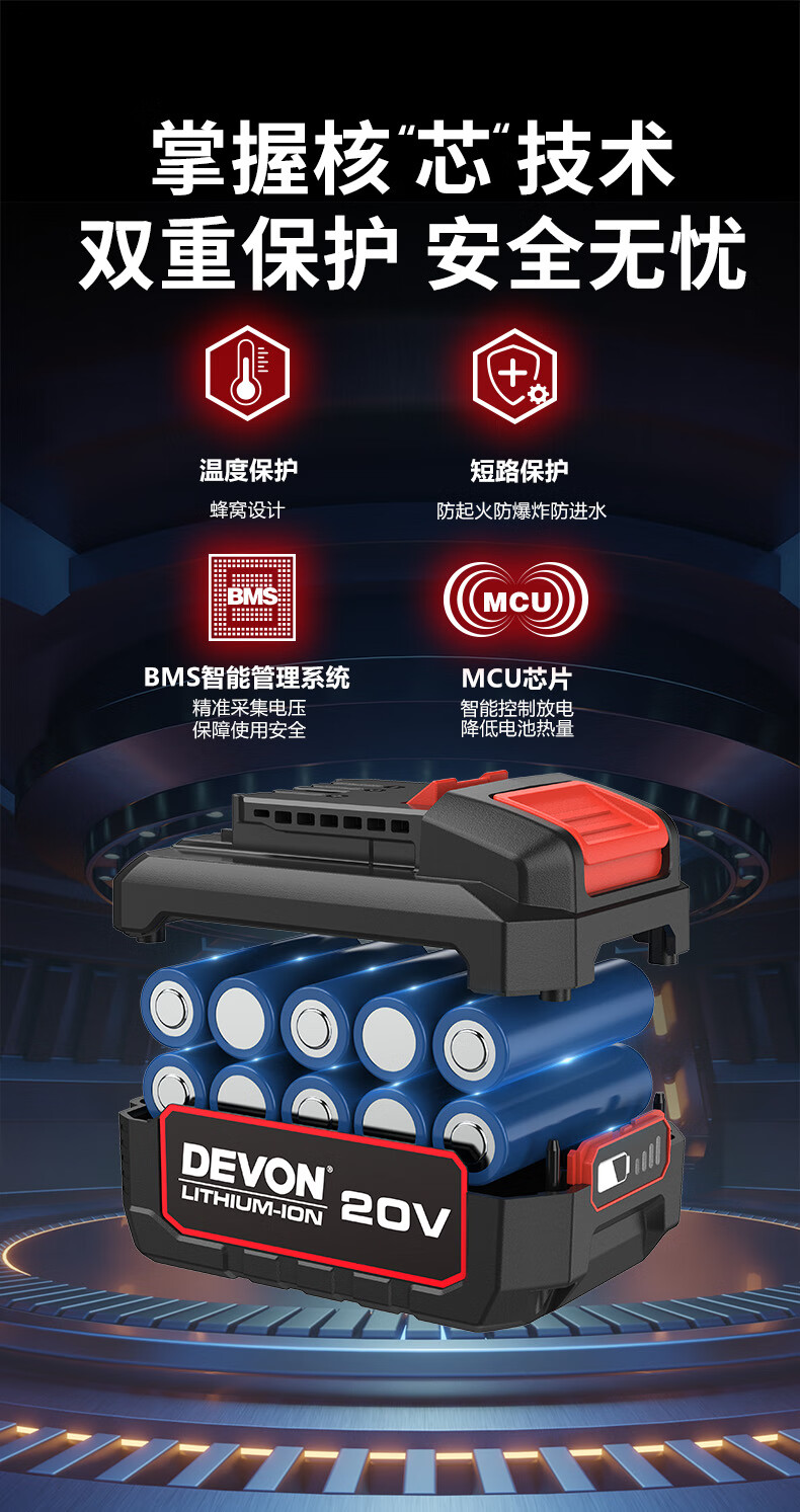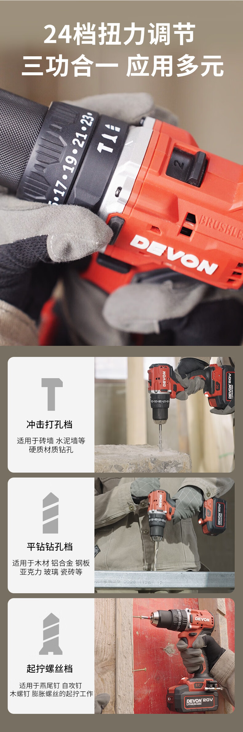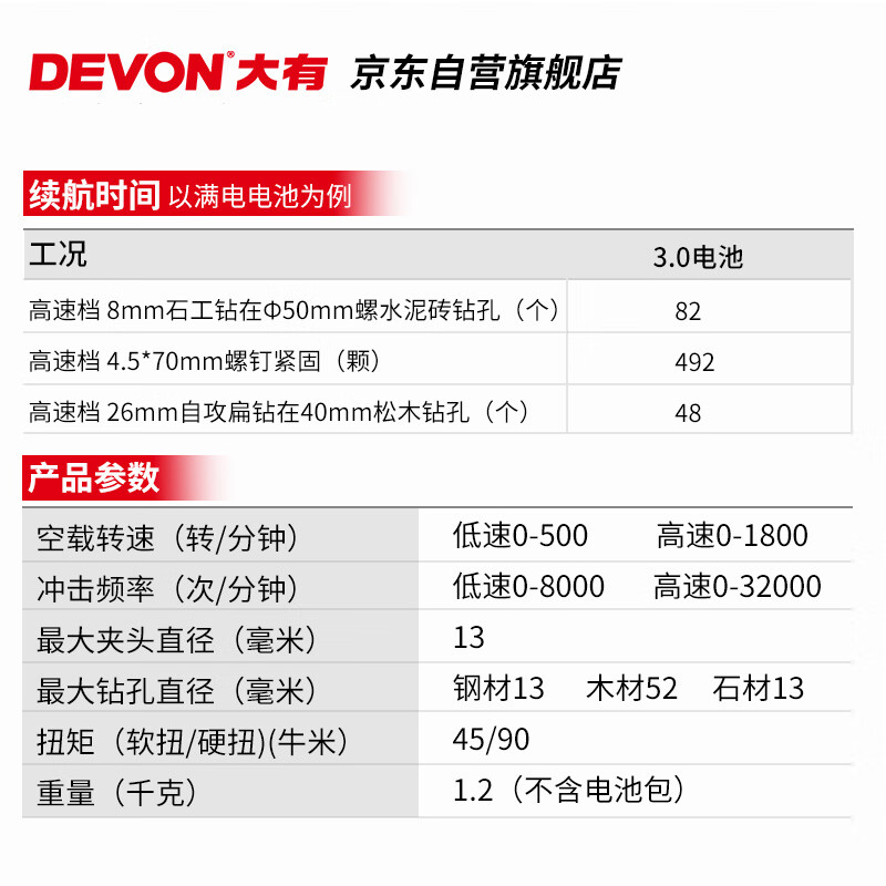 • 商品名称:大有(Devon)20V无刷电动充电手电钻锂电钻两用冲击钻混凝土DID201单电4.0快充 DID201/个