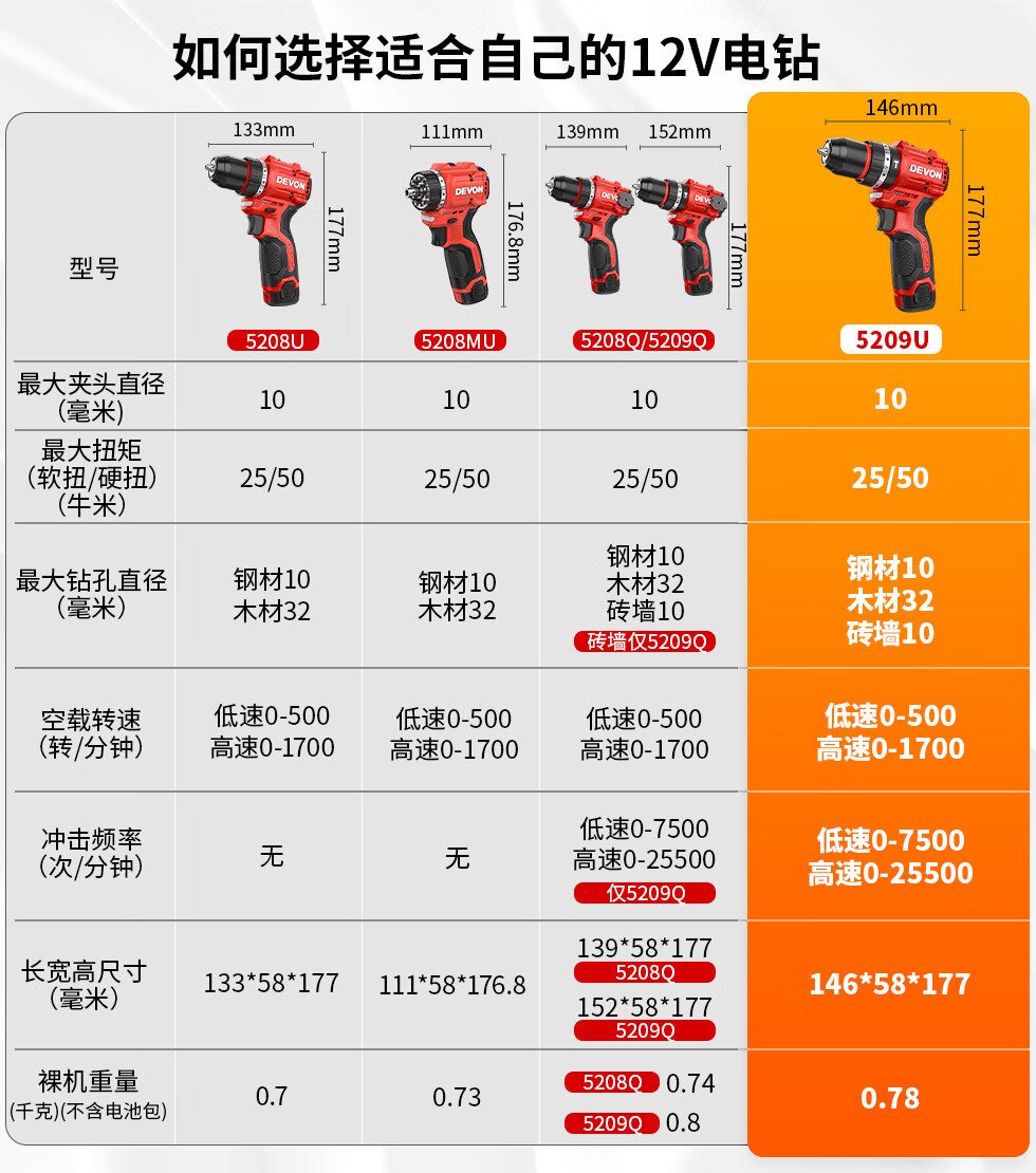 • 商品名称:大有(Devon)京东集采JC系列12V无刷冲击手电钻电动螺丝刀工具5209U自营专供S7 5209U/套