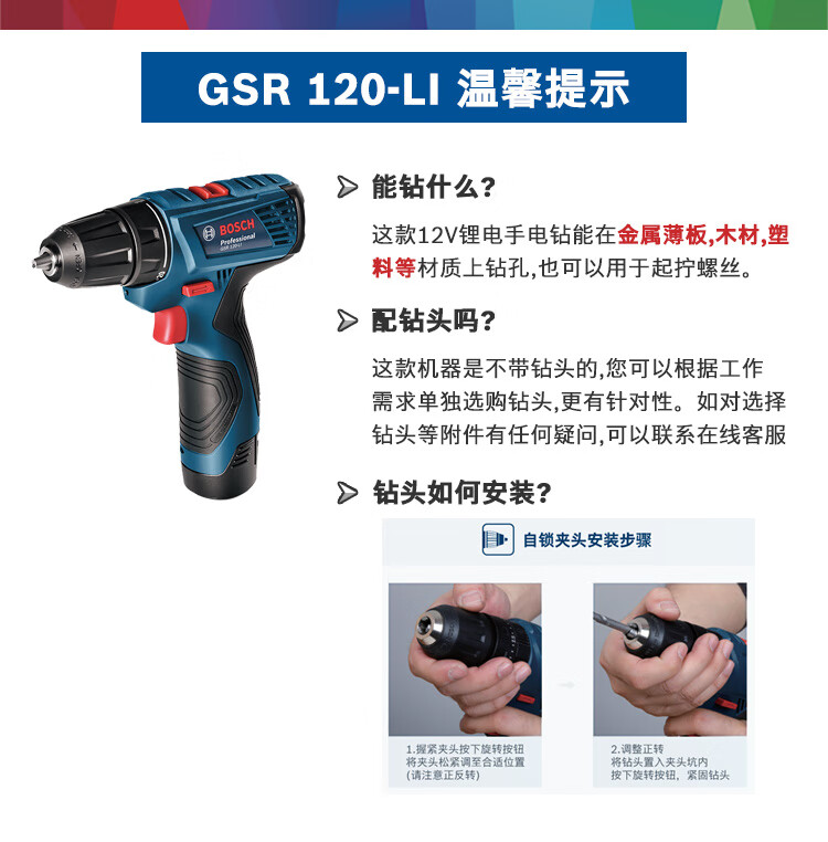 • 商品名称:博世(BOSCH)起子机电钻电动螺丝刀家具钻孔安装GSR120-LI 2.0Ah单电12V锂电 GSR 120-Li 单电版/台
