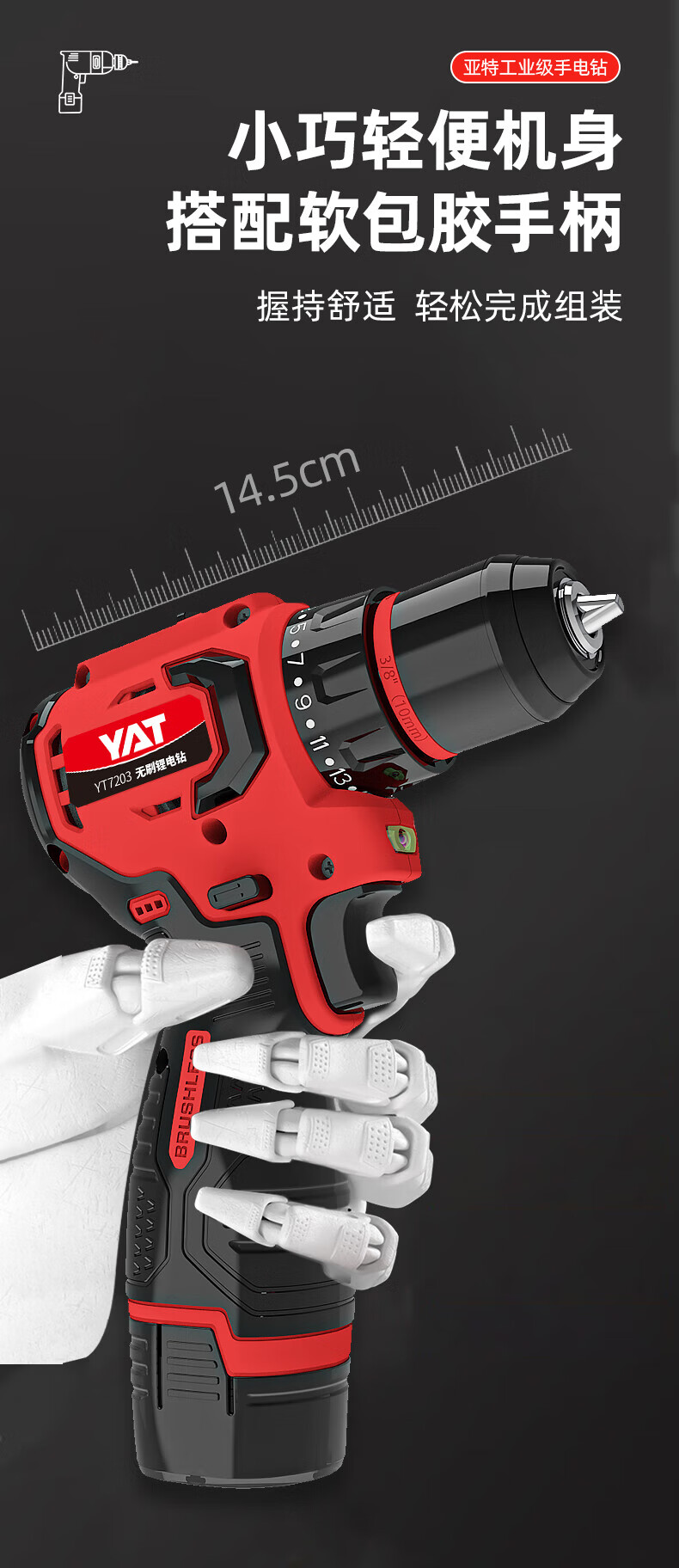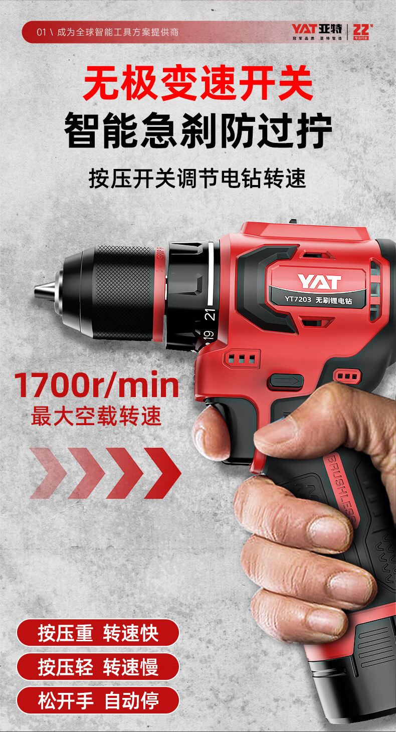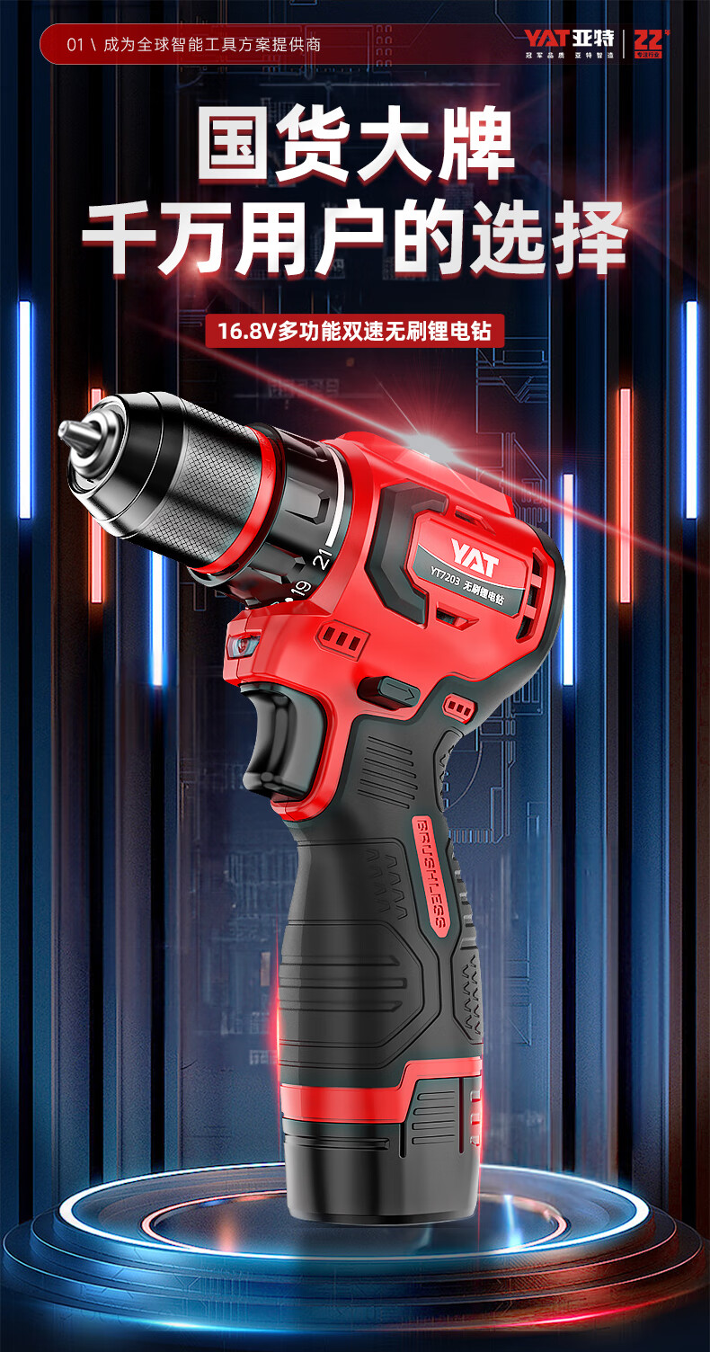 • 商品名称:亚特(YAT)无刷手电钻 小钢炮16V大扭矩手电钻充电钻电动螺丝刀家用起子机 YT7203/台