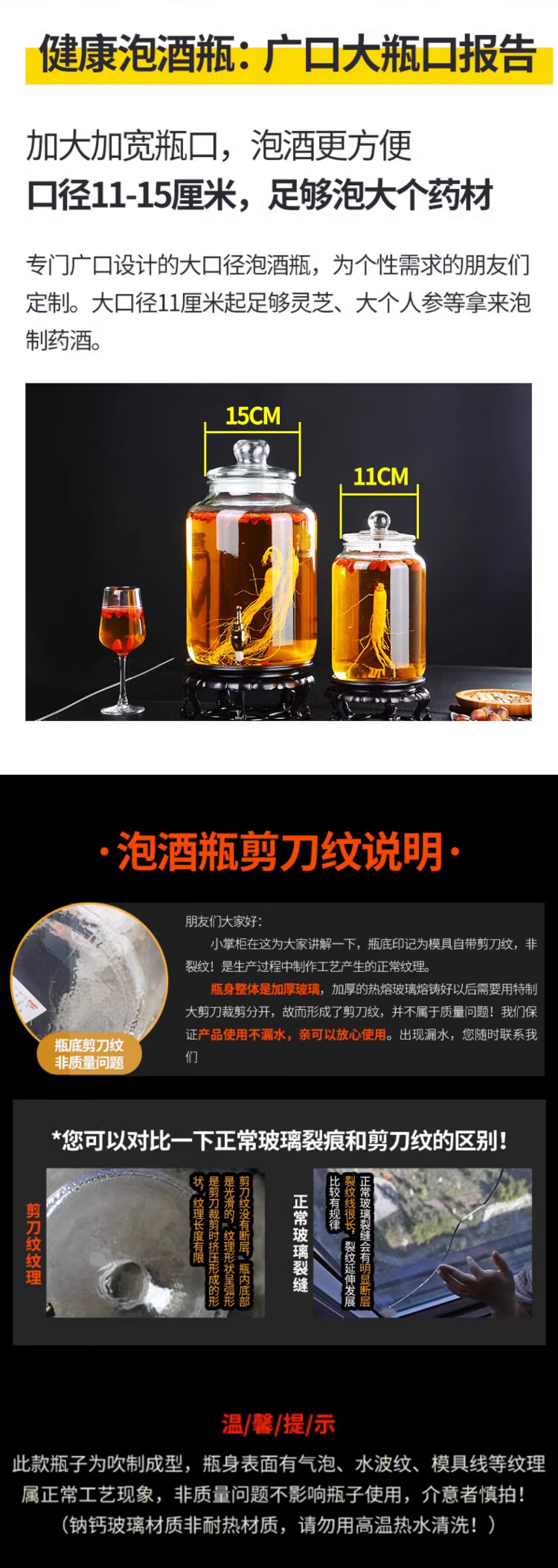• 商品名称:Homeglen 泡酒玻璃瓶密封药酒罐酒缸酒瓶容器 15斤+不锈钢龙头 泡酒玻璃瓶/个
