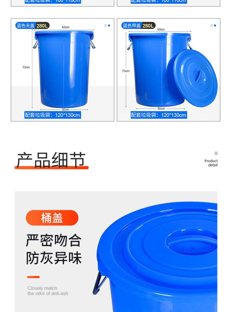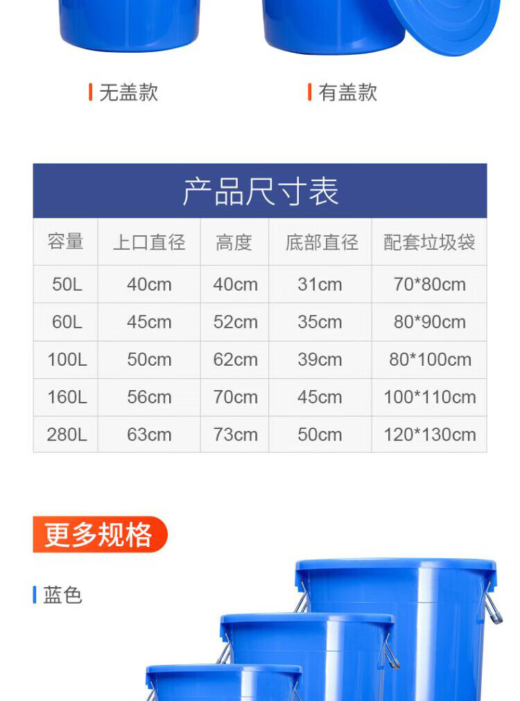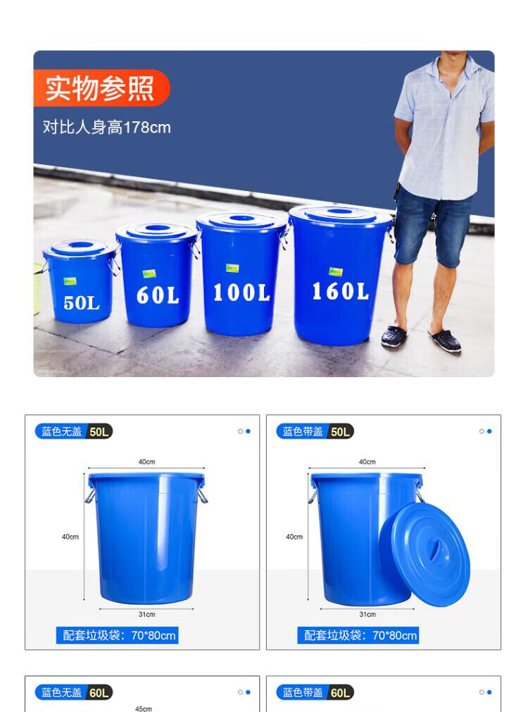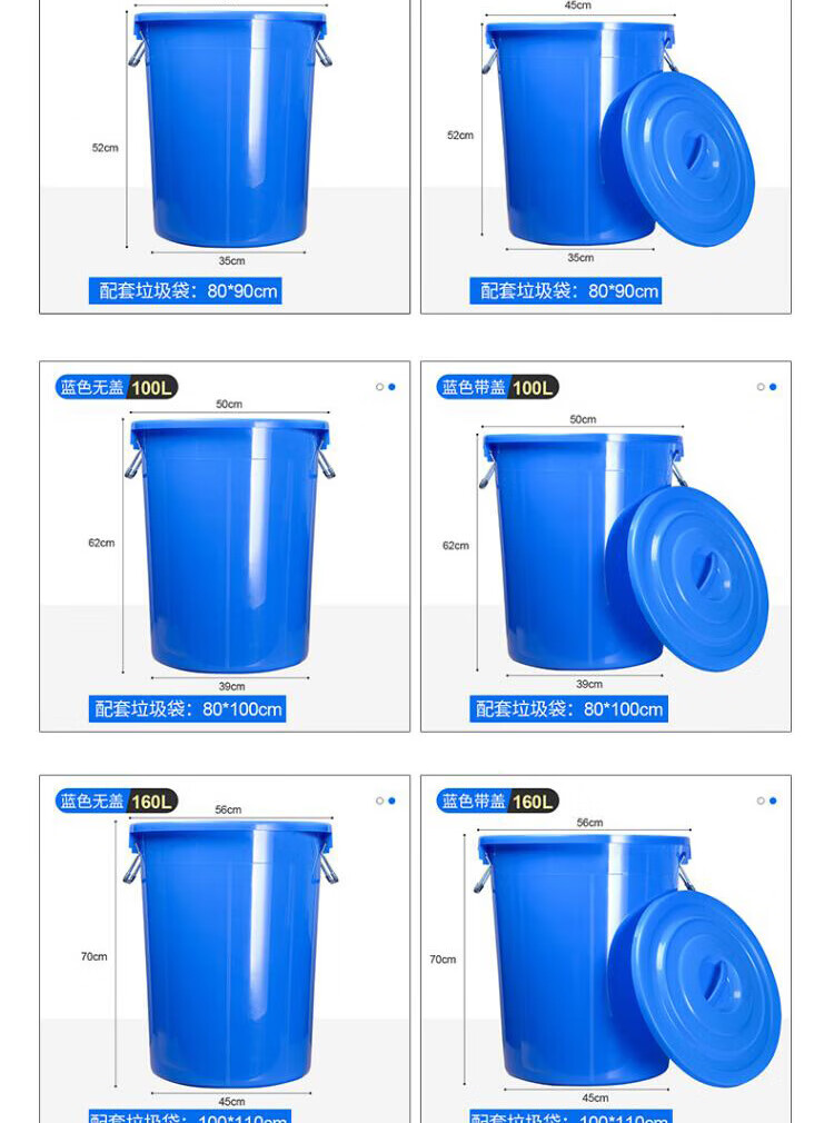 包装清单: 蓝色160L有盖 大号圆形垃圾桶户外大容量加厚带盖塑料收纳桶