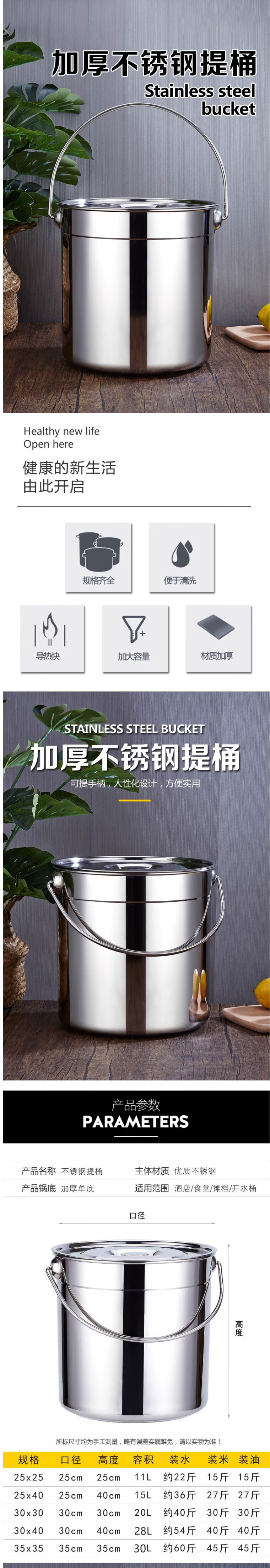 • 商品名称:Homeglen不锈钢圆桶手提式提桶带盖商用家用储水桶油桶 304特厚提桶25*25 不锈钢提桶/个