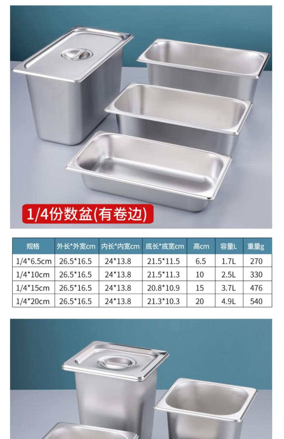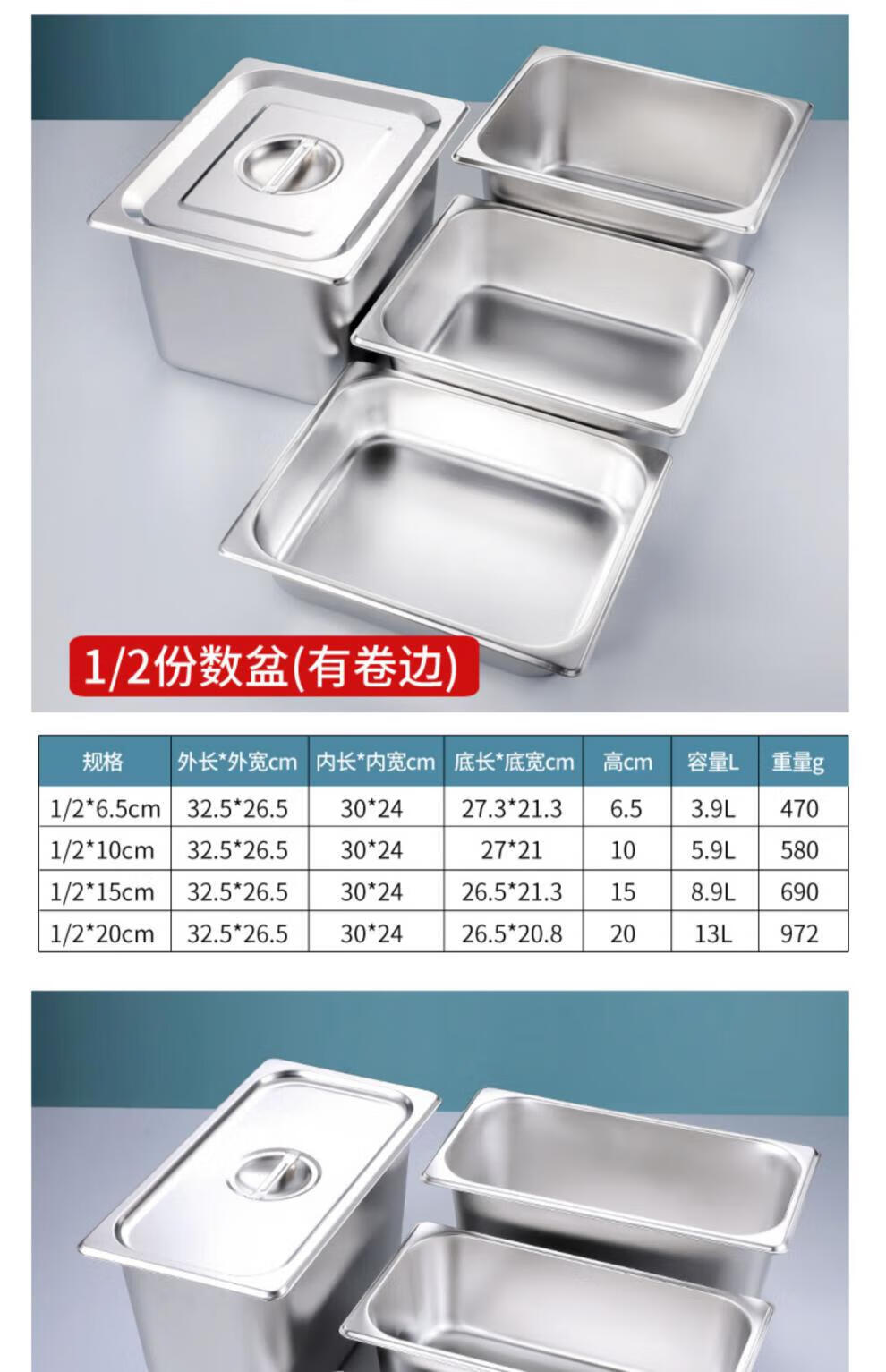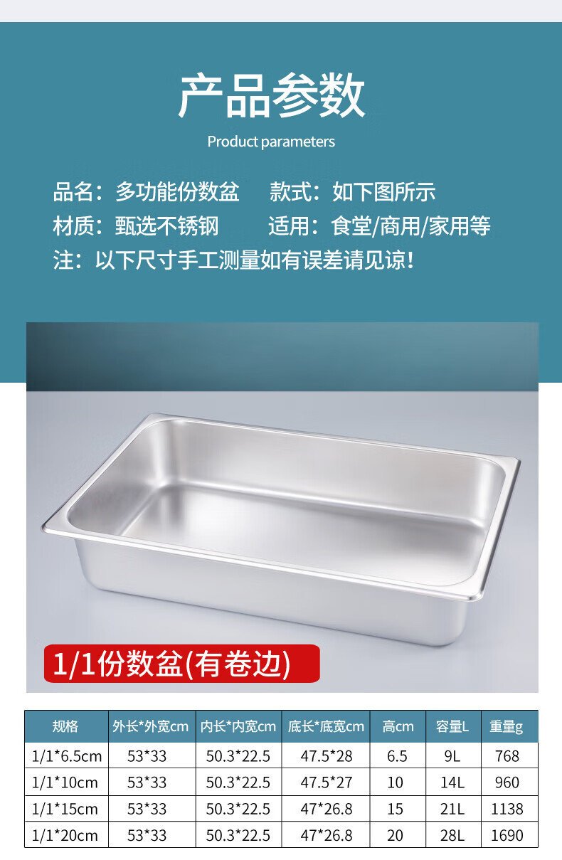 • 商品名称:莱羽炫不锈钢份数盆长方形盆带盖商用 【1/3】32.5*17.5*10cm 高 特厚 【1/3】32.5*17.5*10cm 高 特厚/个
