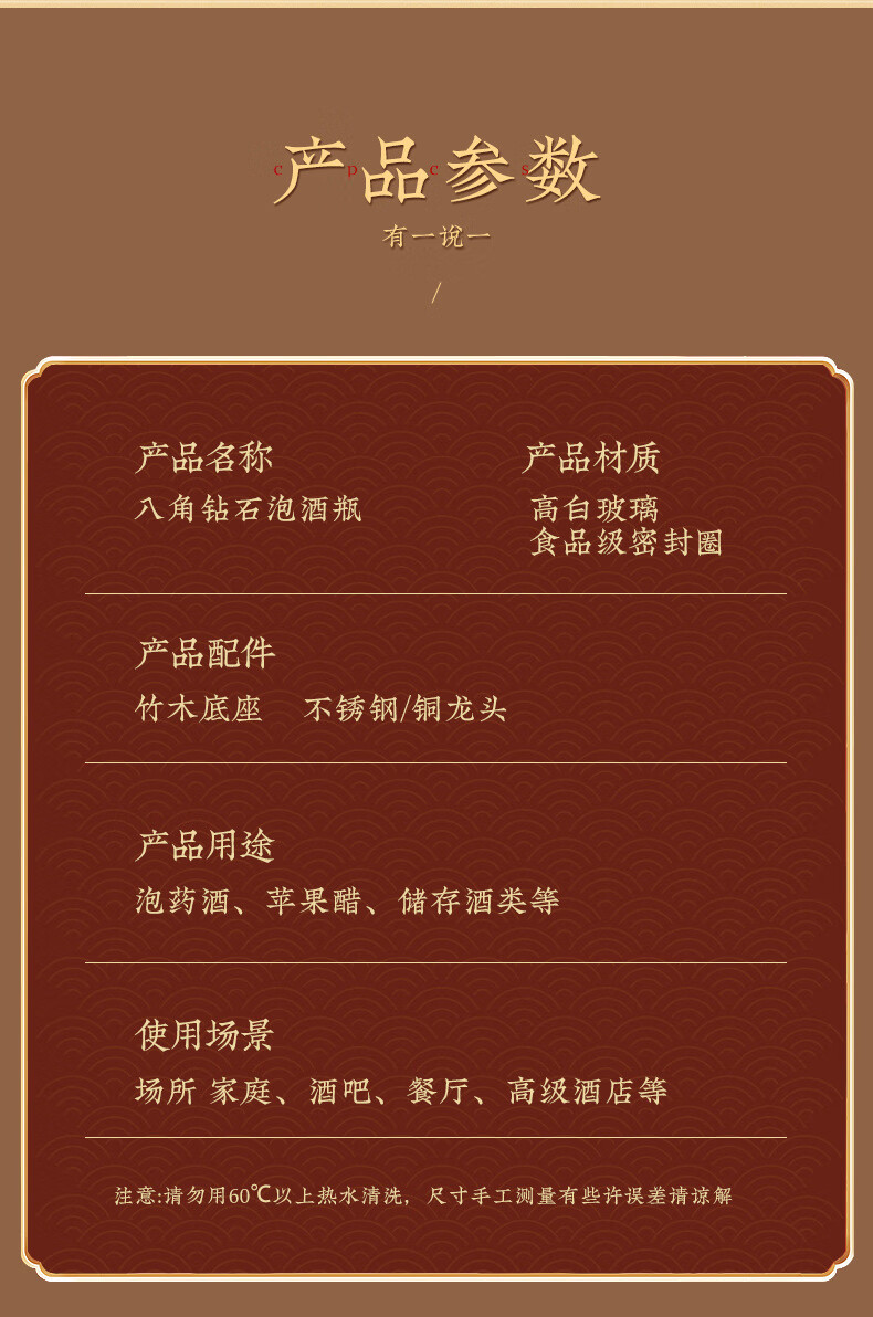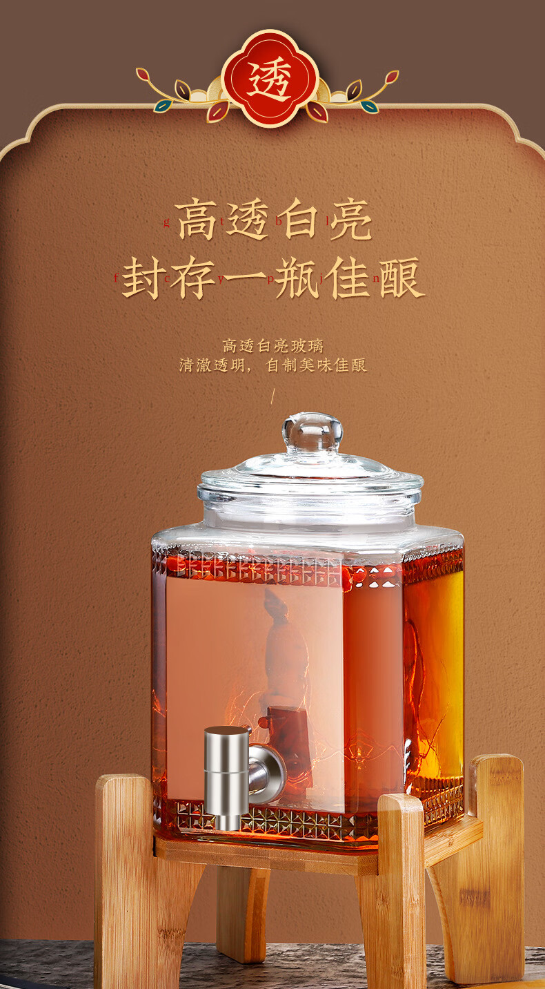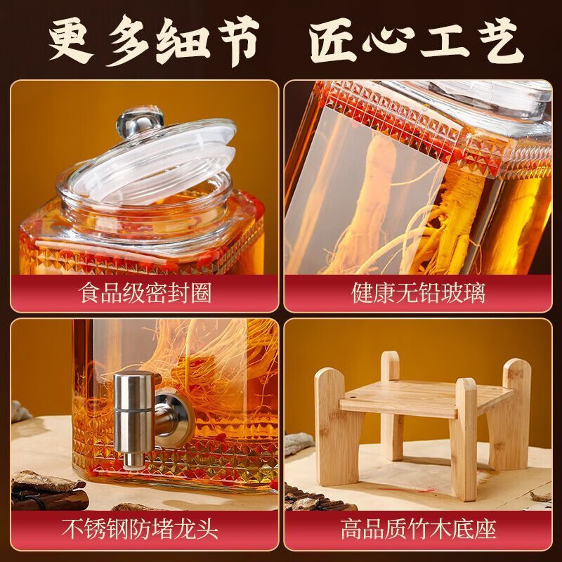 • 商品名称:京清福 泡酒玻璃瓶酿酒坛酒罐加厚家用装酒容器 不锈钢龙头 10斤 10斤不锈钢龙头/个