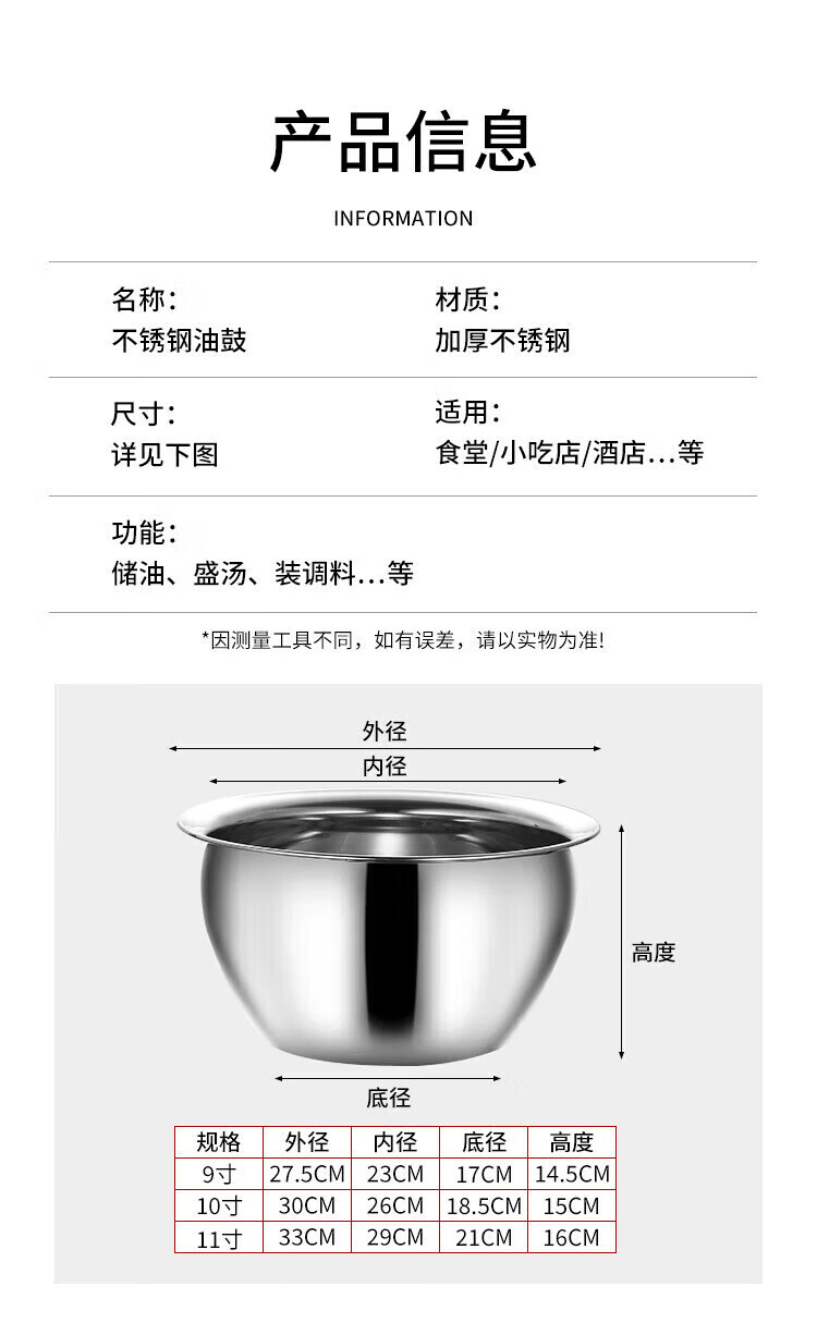 • 商品名称:京清福 加厚不锈钢油盆带盖商用装油缸鼓形涨形油桶调料盆 10寸油鼓+盖 10寸油鼓+盖/个