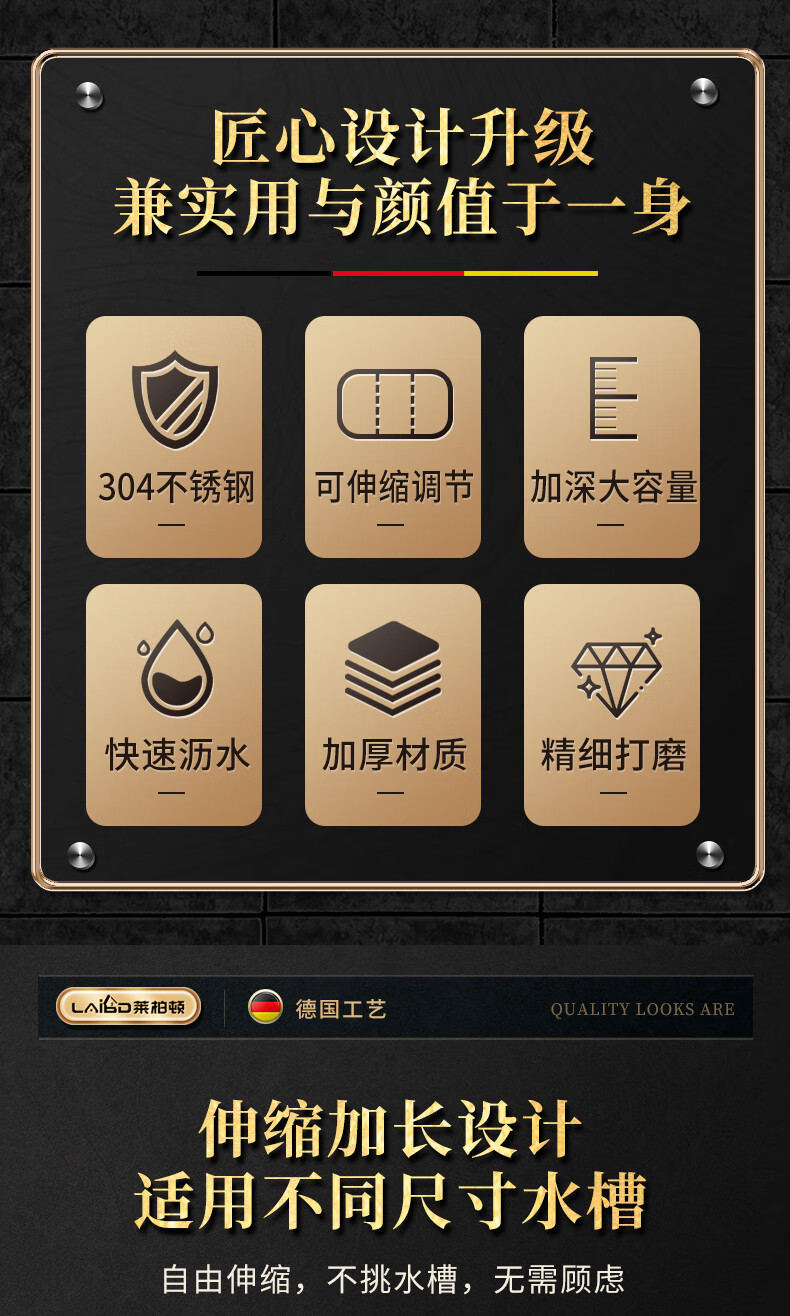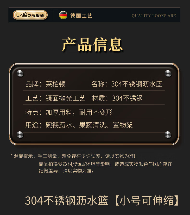 莱柏顿304不锈钢沥水篮厨房水槽水池过滤筐果蔬洗菜篮水果篮可伸缩大号 304水果篮沥水款-大号【可伸缩】/个