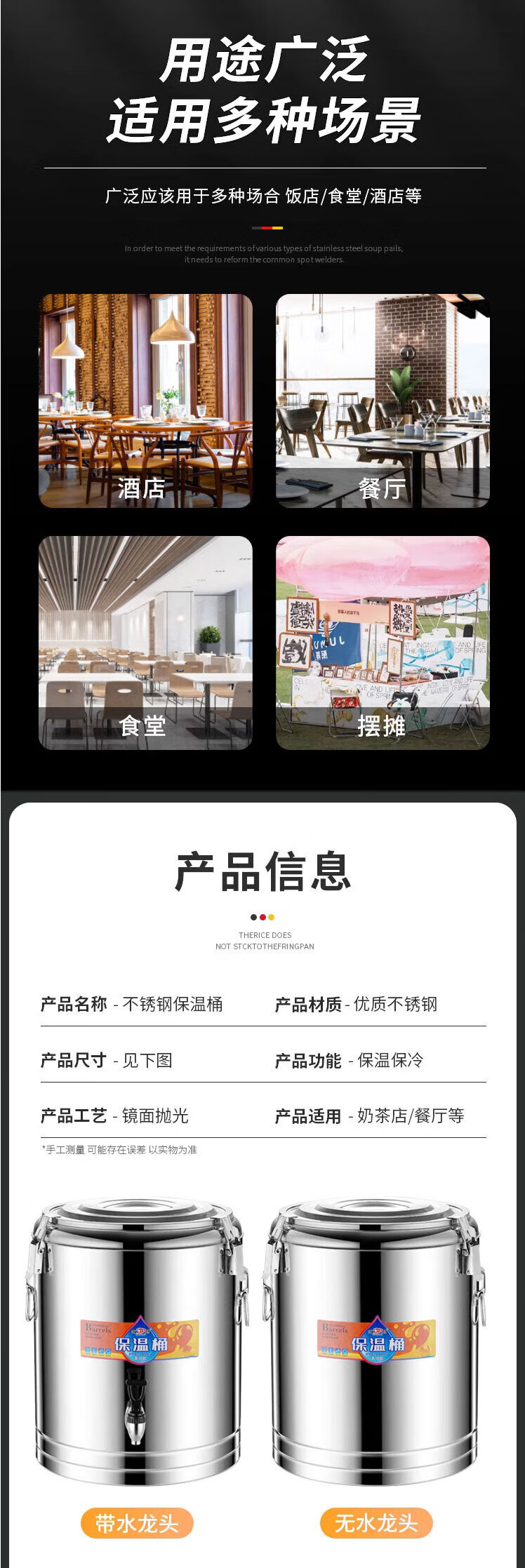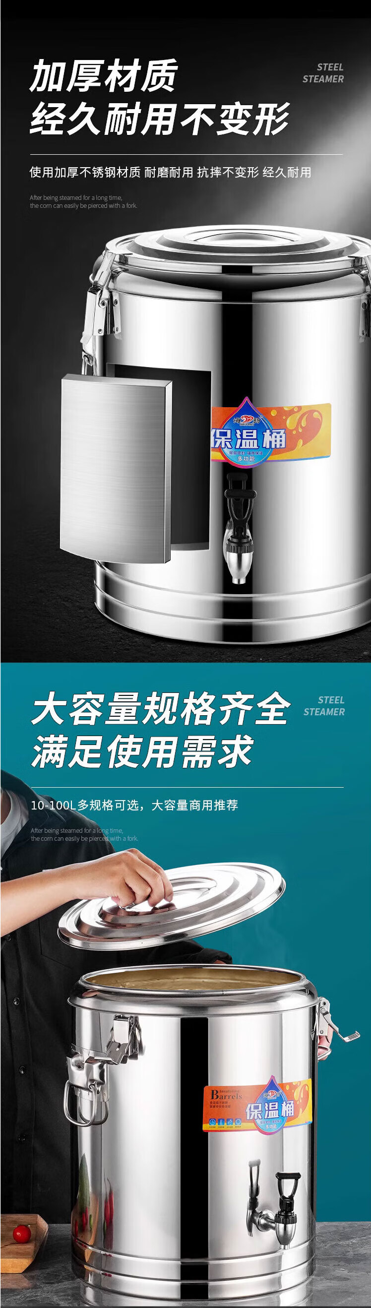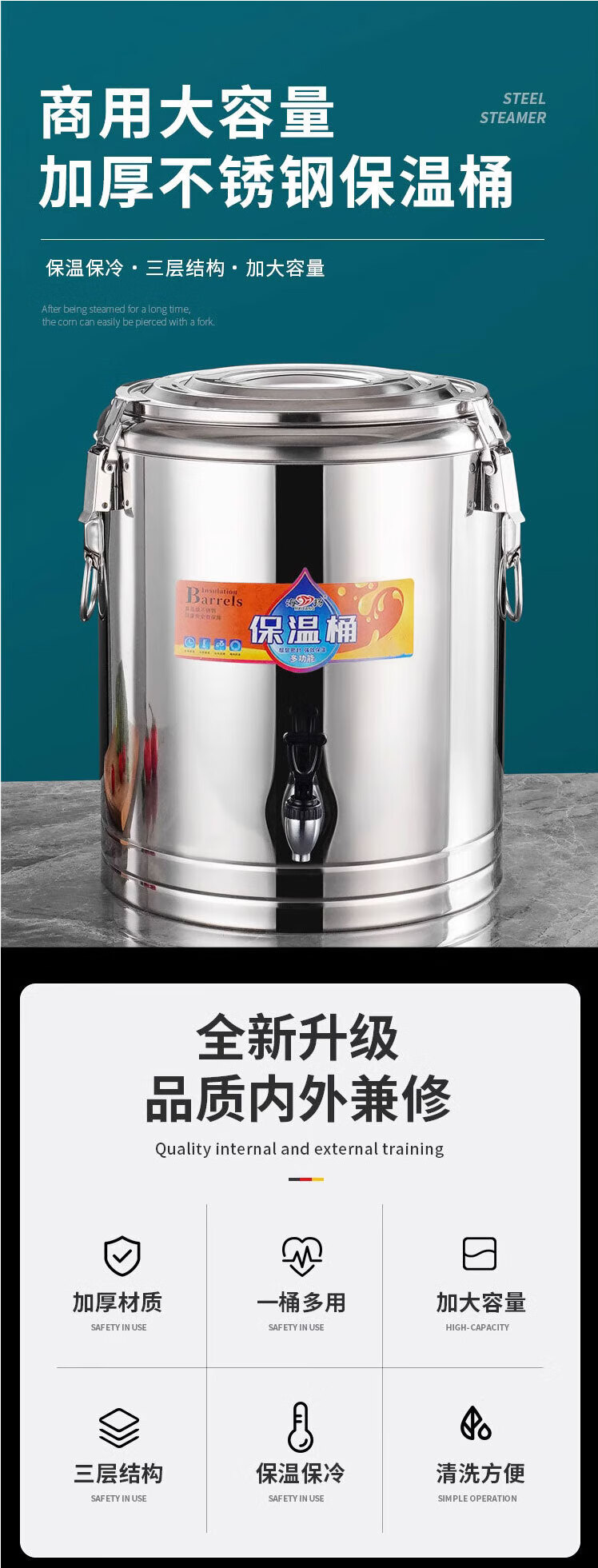 • 商品名称:海扬不锈钢保温桶奶茶桶汤桶米饭桶茶水桶商用大容量 20斤(单水龙头) 不锈钢保温桶/只