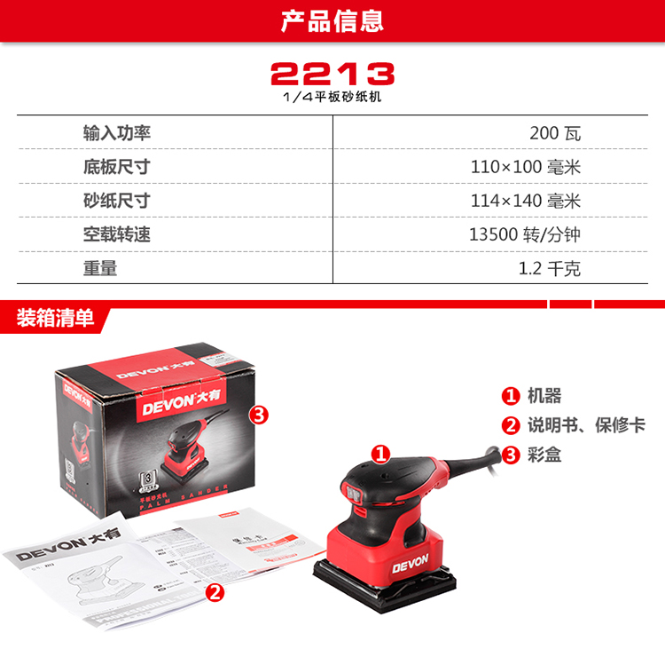 五金/工具  > 电动工具  > 抛光机  >  大有/Devon  >  大有(Devon)1/4平板砂光机2213砂纸机家具木材腻子打磨抛光木工工具 2213/台