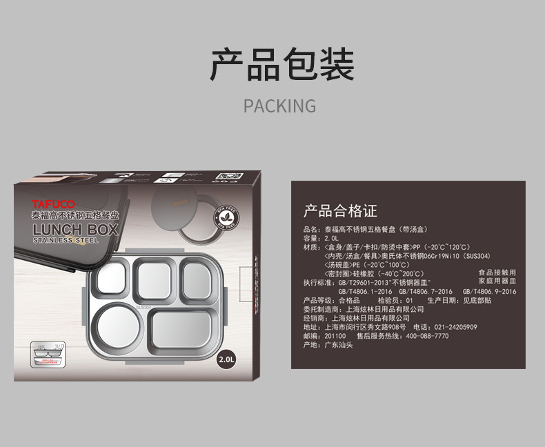 商品名称: 泰福高(TAFUCO)饭盒304不锈钢五格餐盘防烫学生便当盒配餐具保温袋2L T5216N棕色 饭盒/个