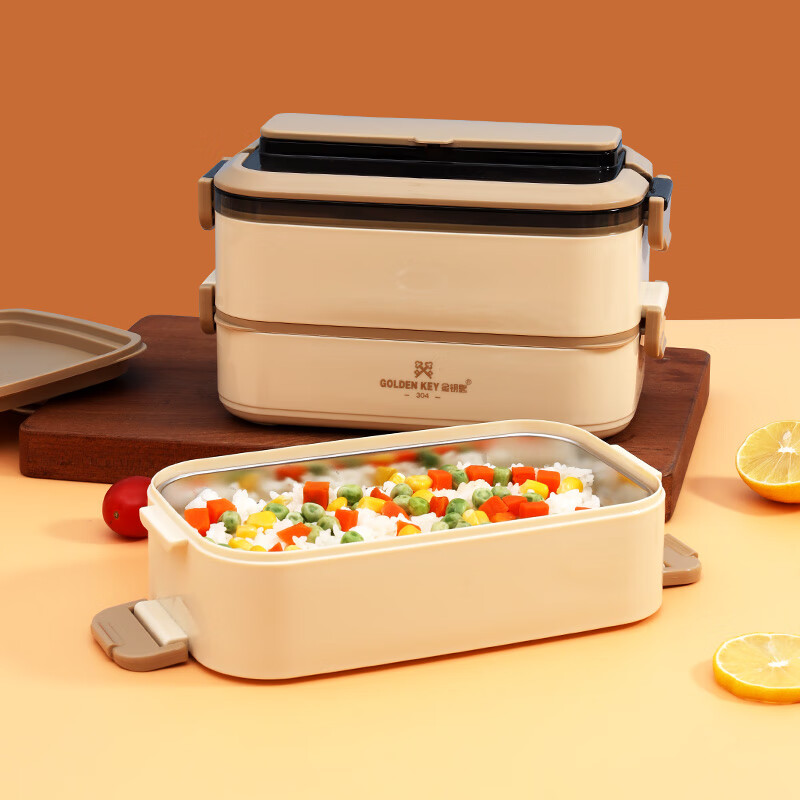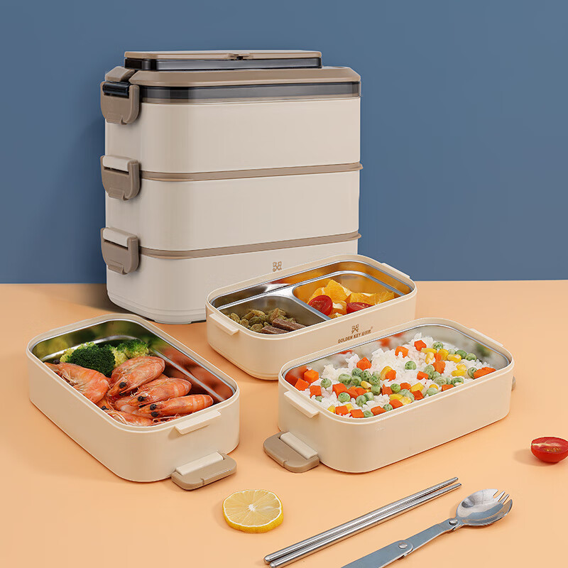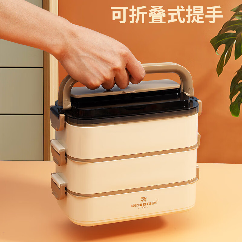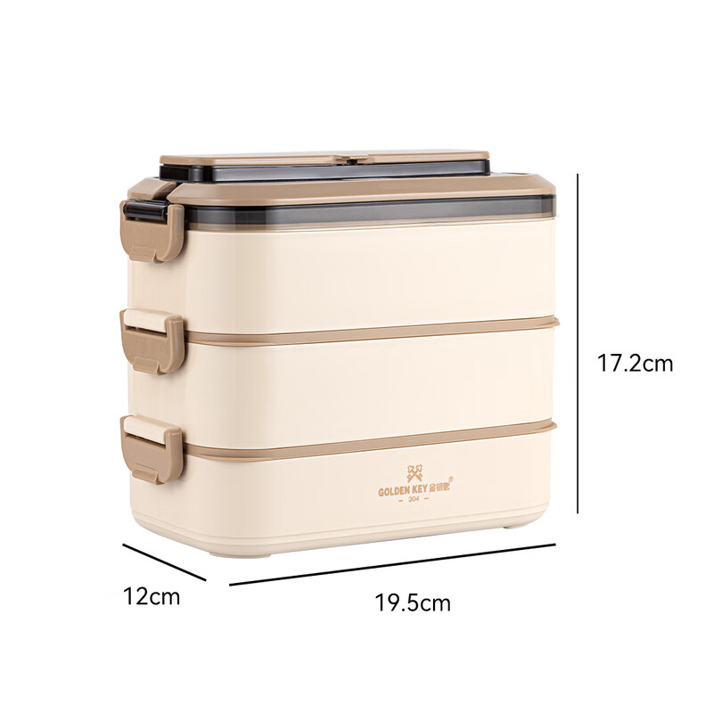 金钥匙(GOLDEN KEY)304不锈钢2.1L防溢三层便当多层可组合保温饭盒卡其色GK-2100FH-K 304不锈钢/套