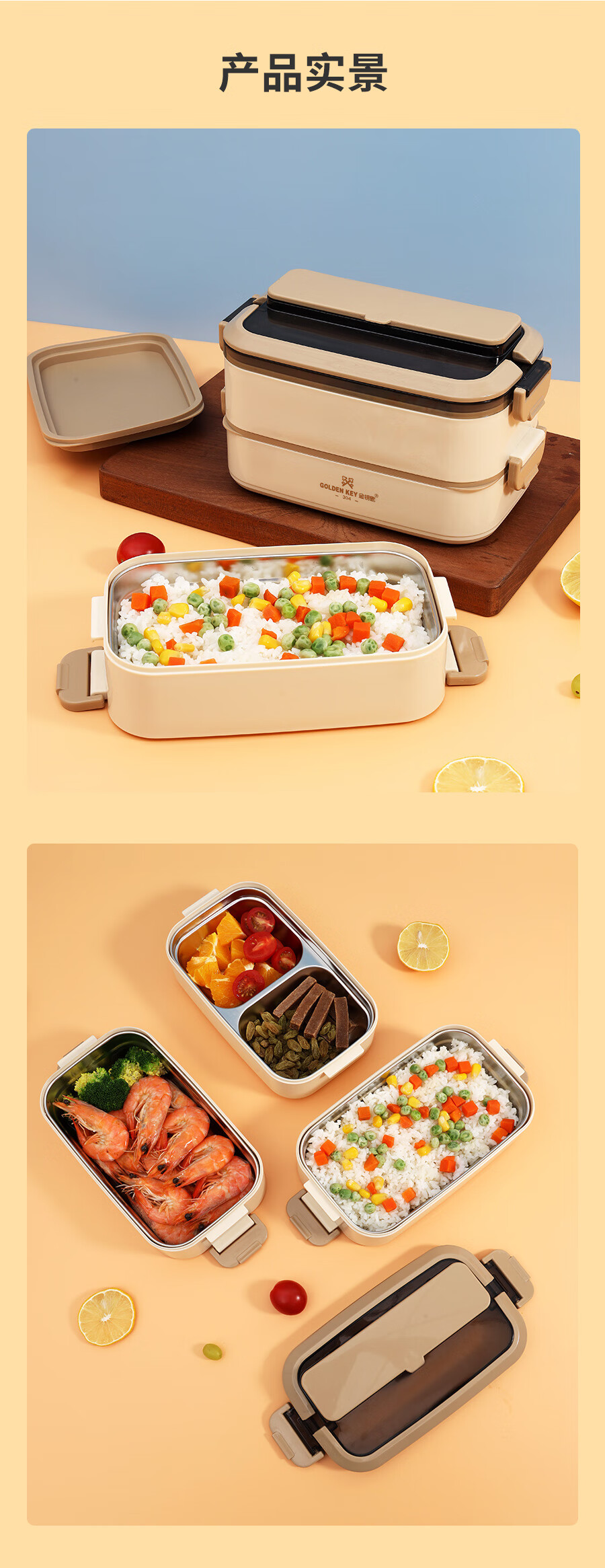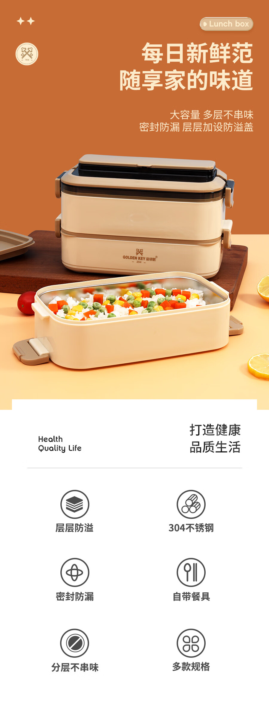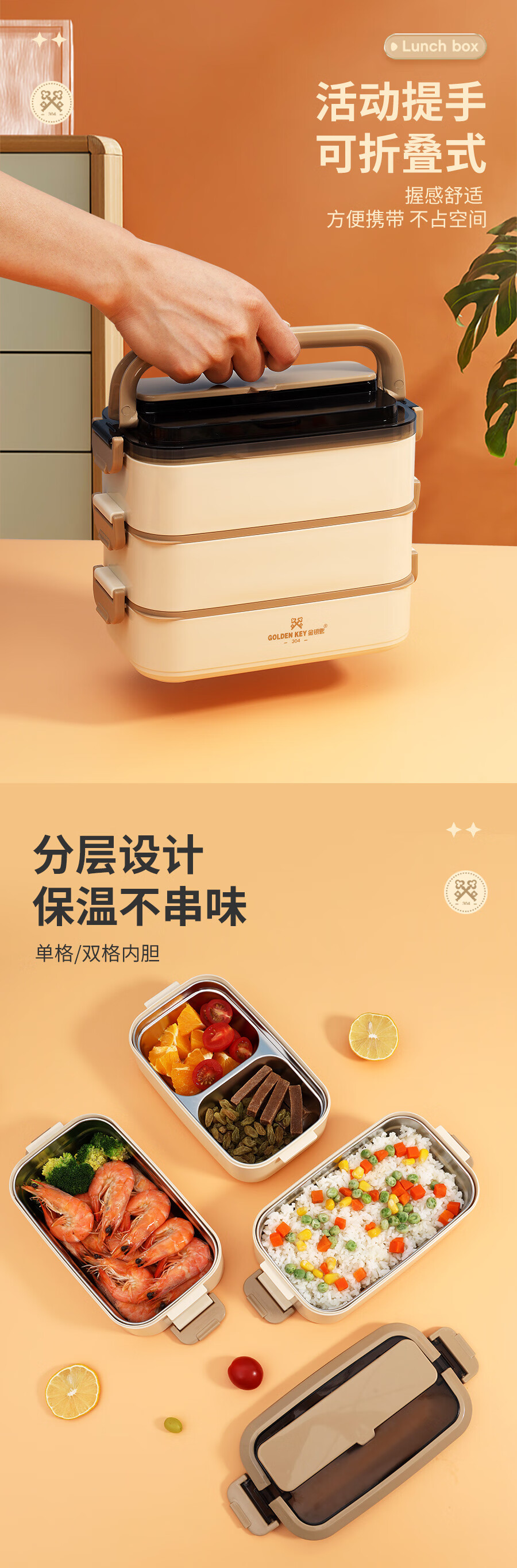 厨具  > 厨房储物  > 饭盒/提锅  >  金钥匙/GOLDEN KEY  >  金钥匙(GOLDEN KEY)304不锈钢2.1L防溢三层便当多层可组合保温饭盒卡其色GK-2100FH-K 304不锈钢/套