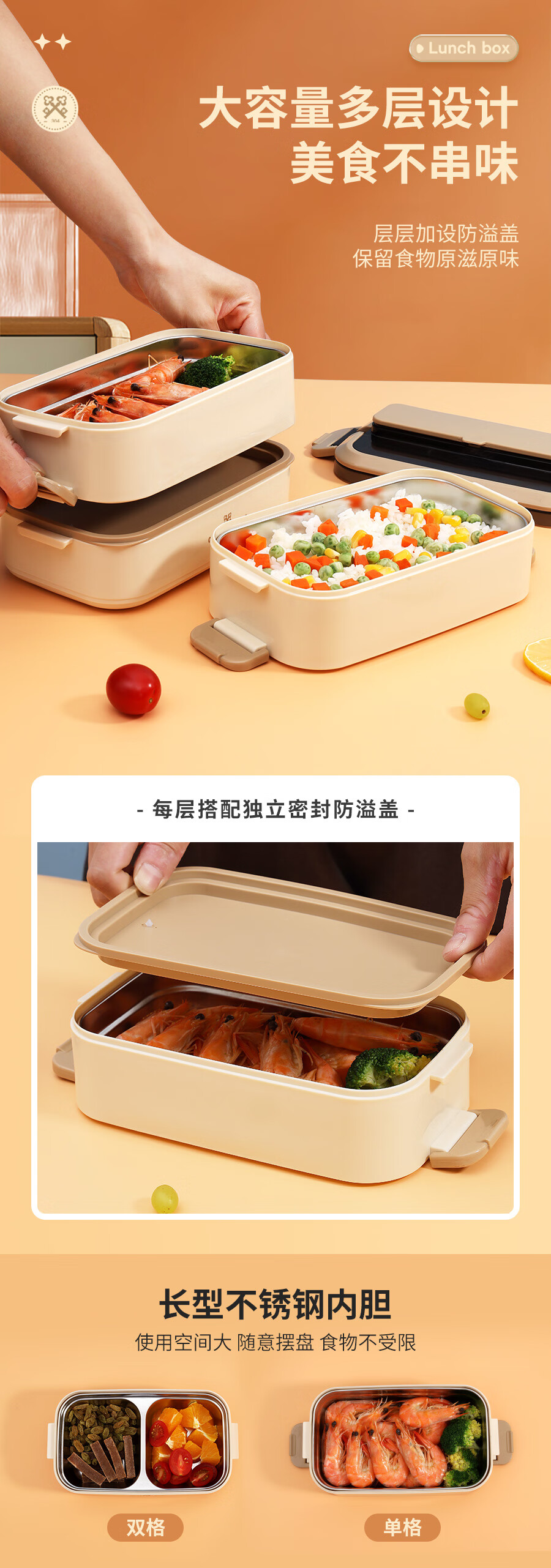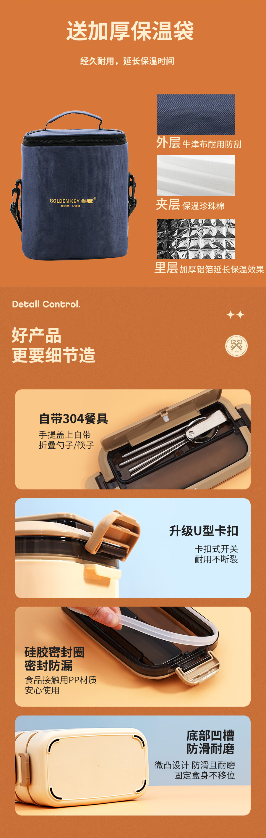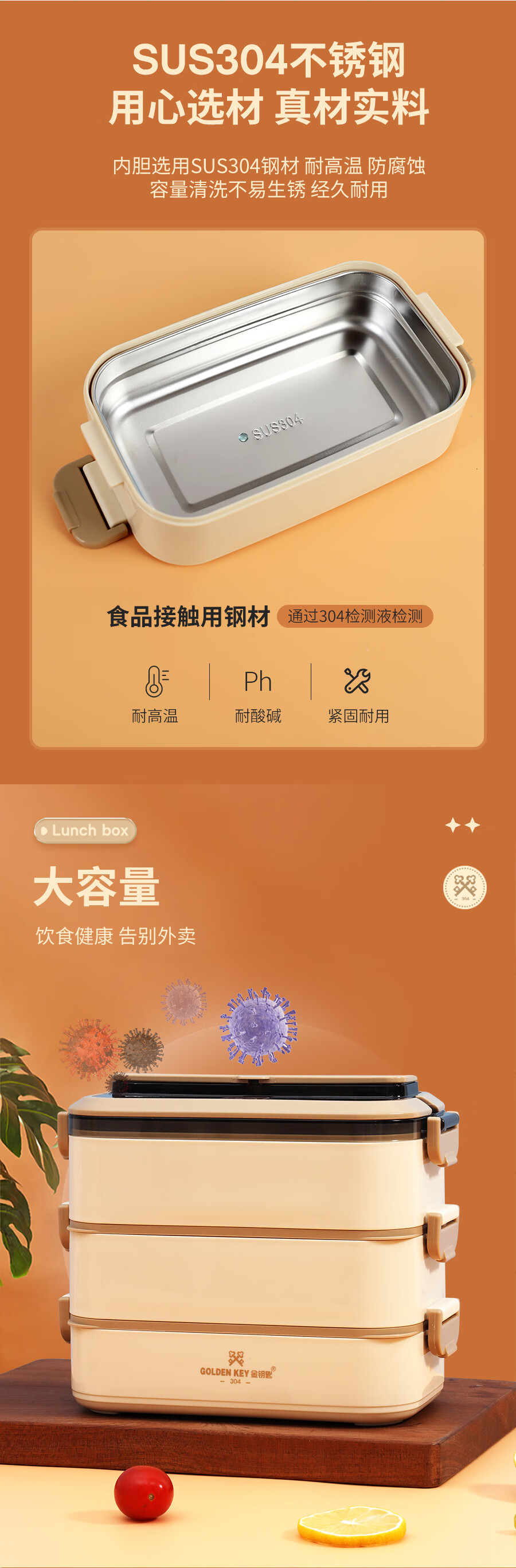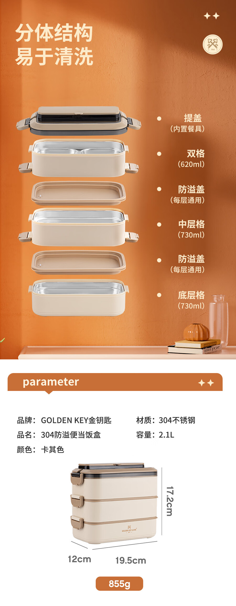 • 商品名称:金钥匙(GOLDEN KEY)304不锈钢2.1L防溢三层便当多层可组合保温饭盒卡其色GK-2100FH-K 304不锈钢/套