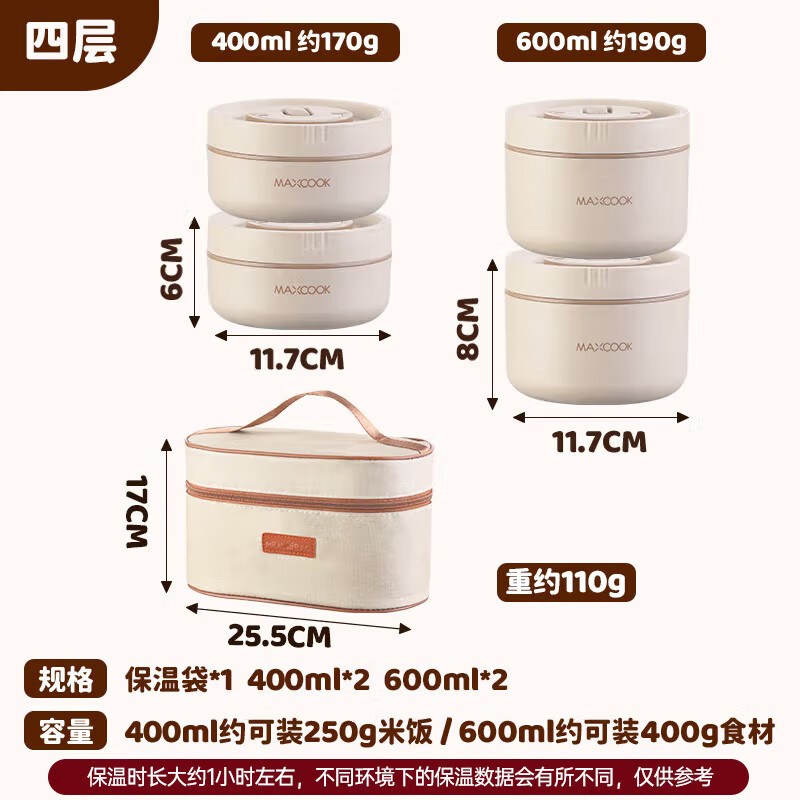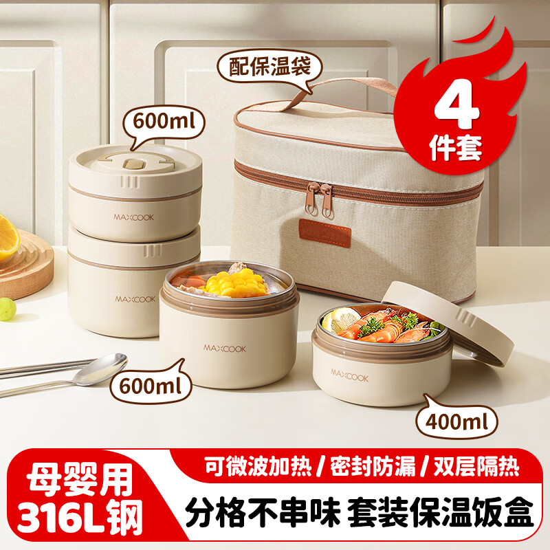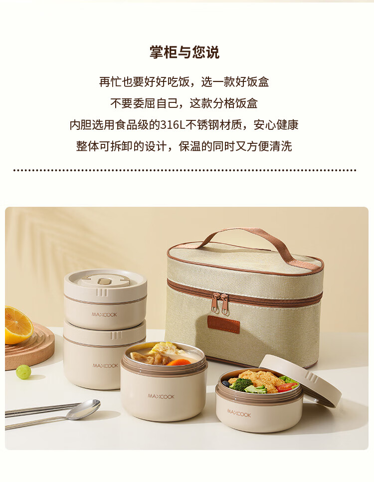 商品名称: 美厨(maxcook)保温饭盒 316L不锈钢便当盒微波炉加热学生上班餐盒配袋MCFT4442 316L不锈钢饭盒餐盒/个