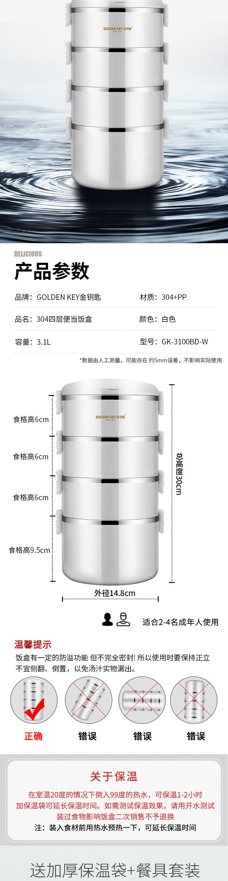 • 商品名称:金钥匙(GOLDEN KEY)304不锈钢四层防溢保温饭盒多层组合便当盒3.1L珍珠白GK-3100BD-W 304不锈钢/套
