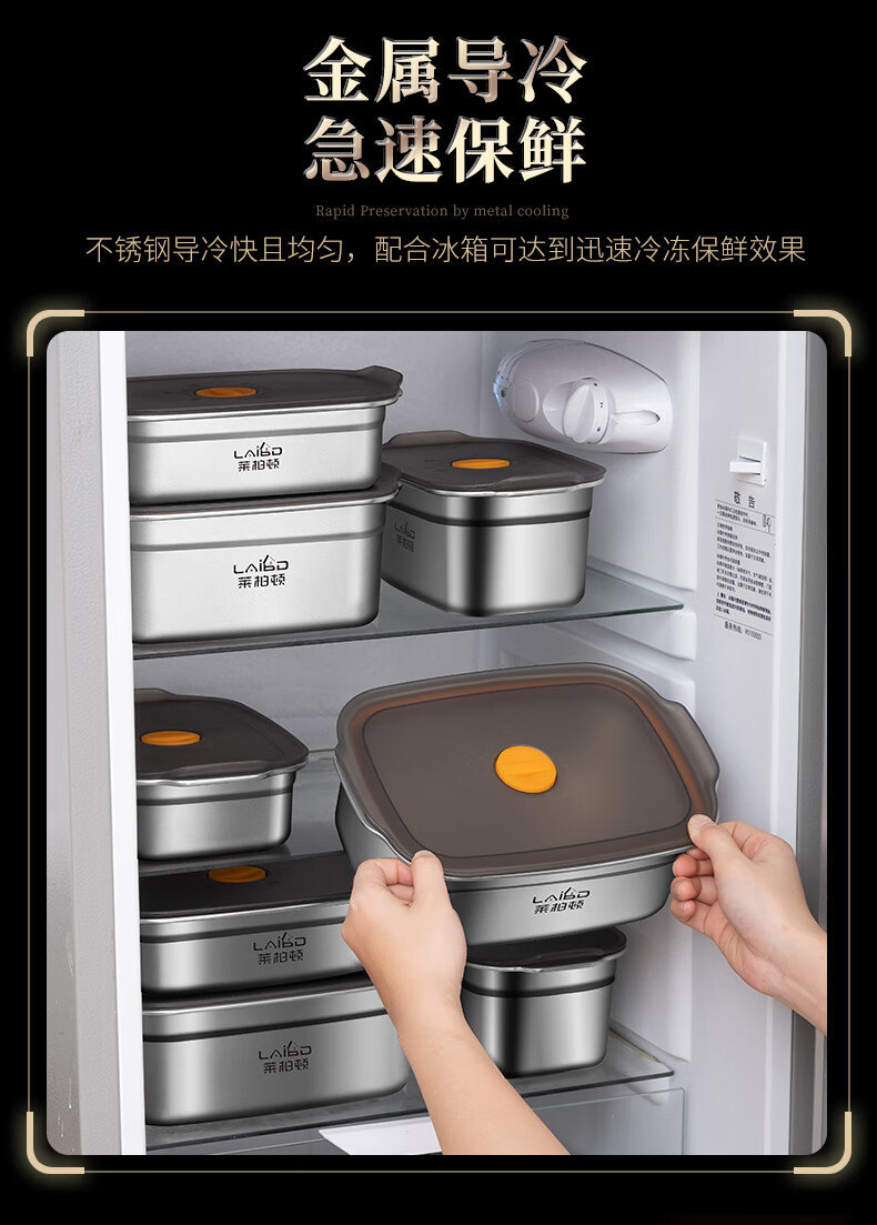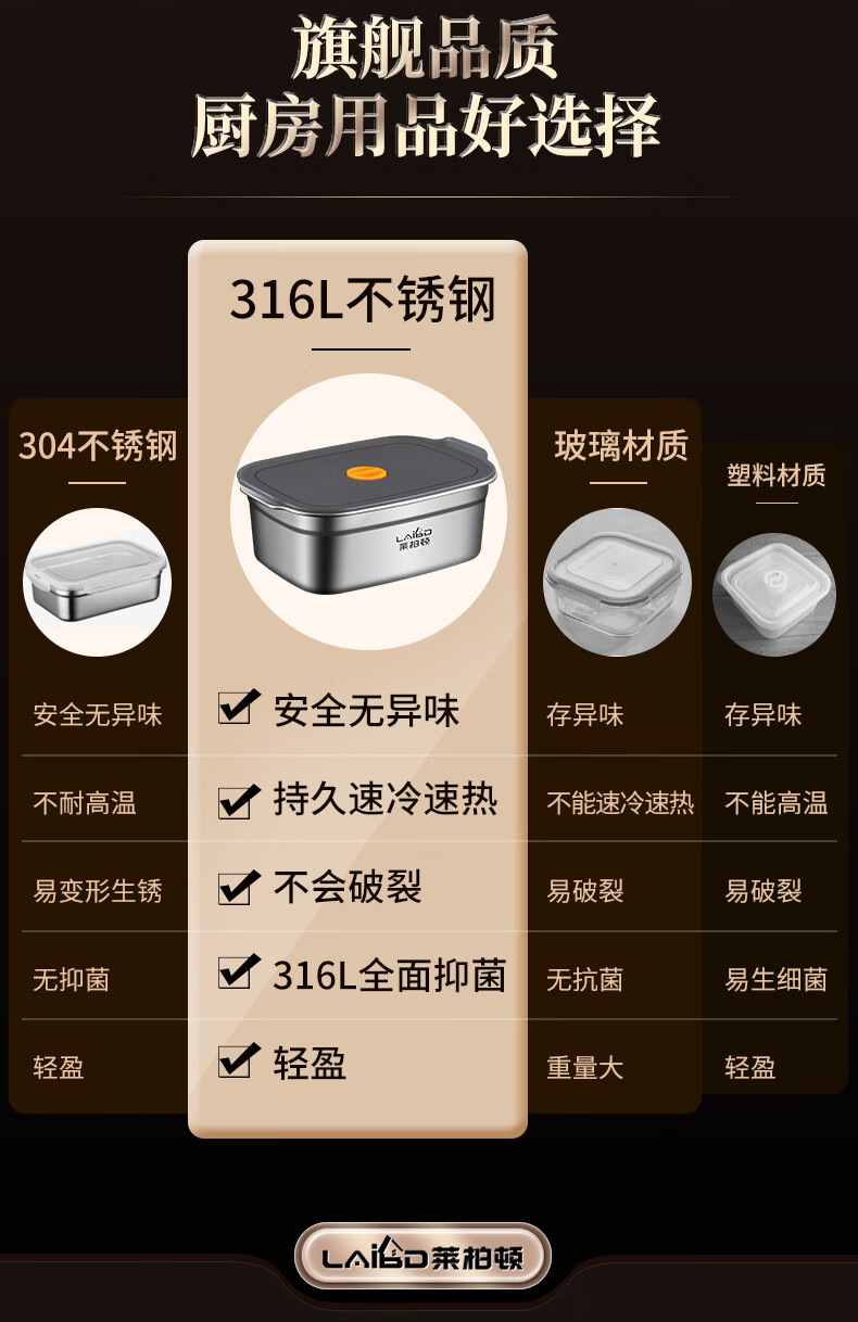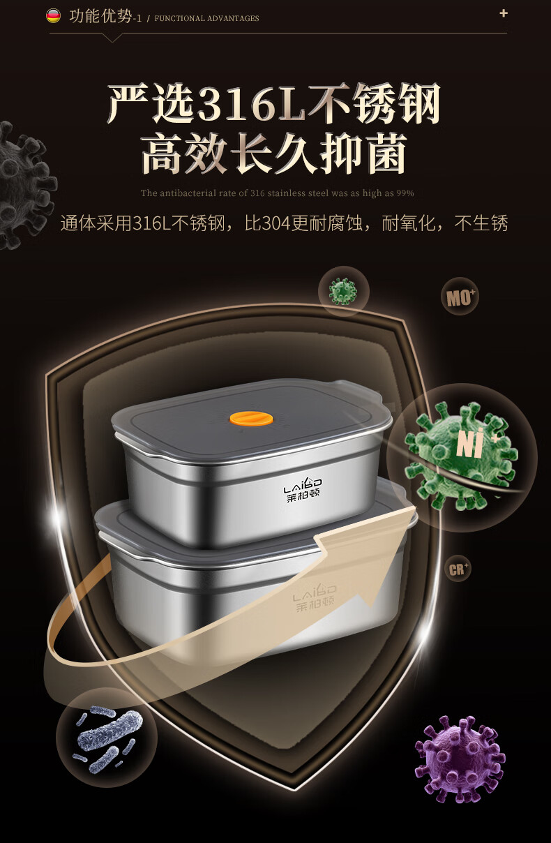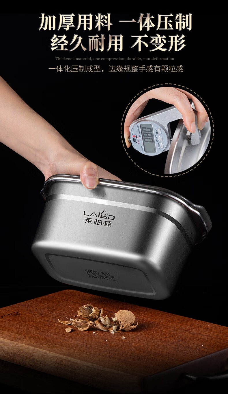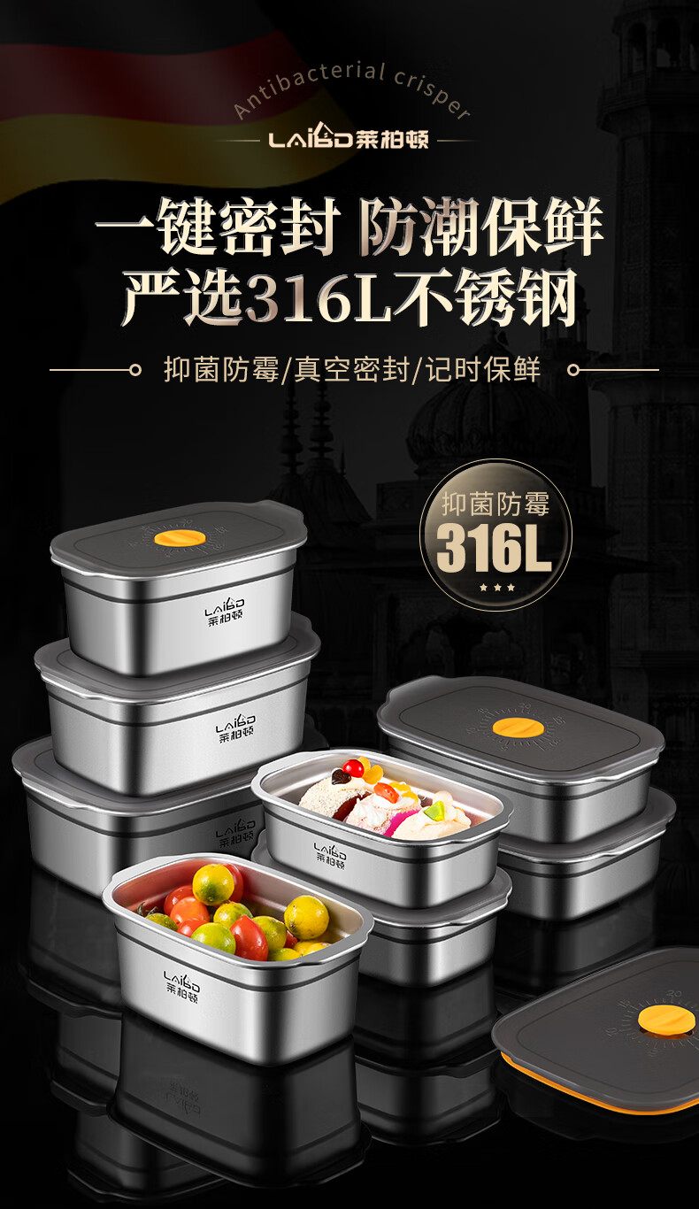 • 商品名称:莱柏顿德国316L不锈钢保鲜盒冰箱收纳盒微真空锁鲜密封野餐水果盒子饭盒 316L方形保鲜盒【800ML*1】矮款/套