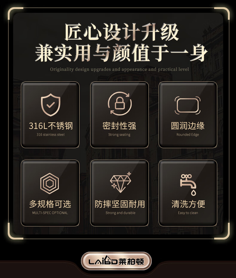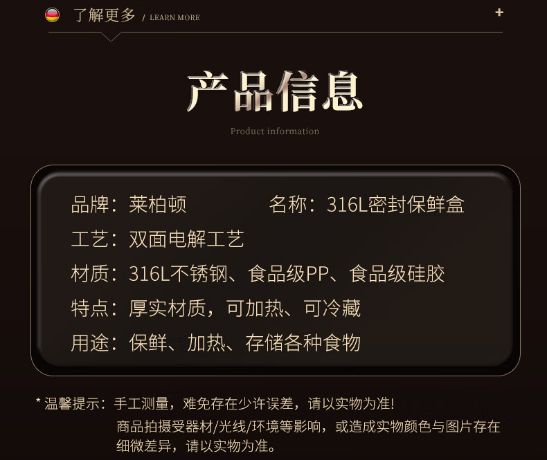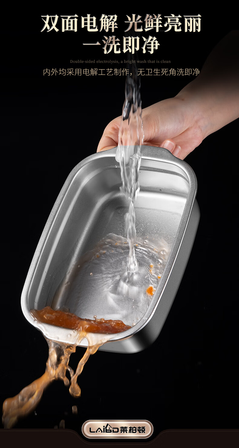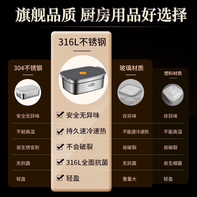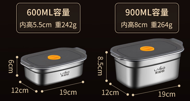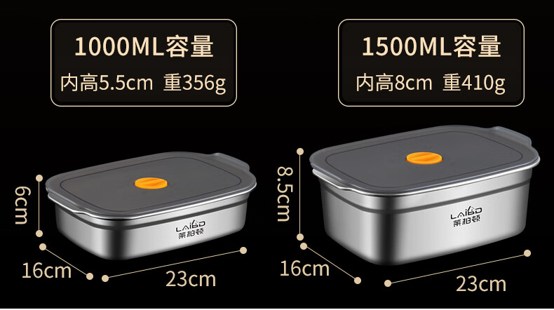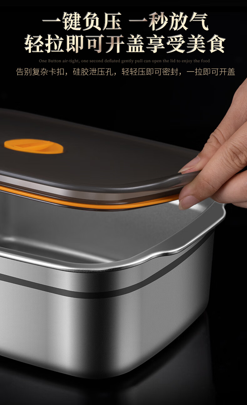 • 商品名称:莱柏顿德国316L不锈钢保鲜盒冰箱收纳盒微真空锁鲜密封野餐水果盒子饭盒 316L方形保鲜盒【800ML*1】矮款/套