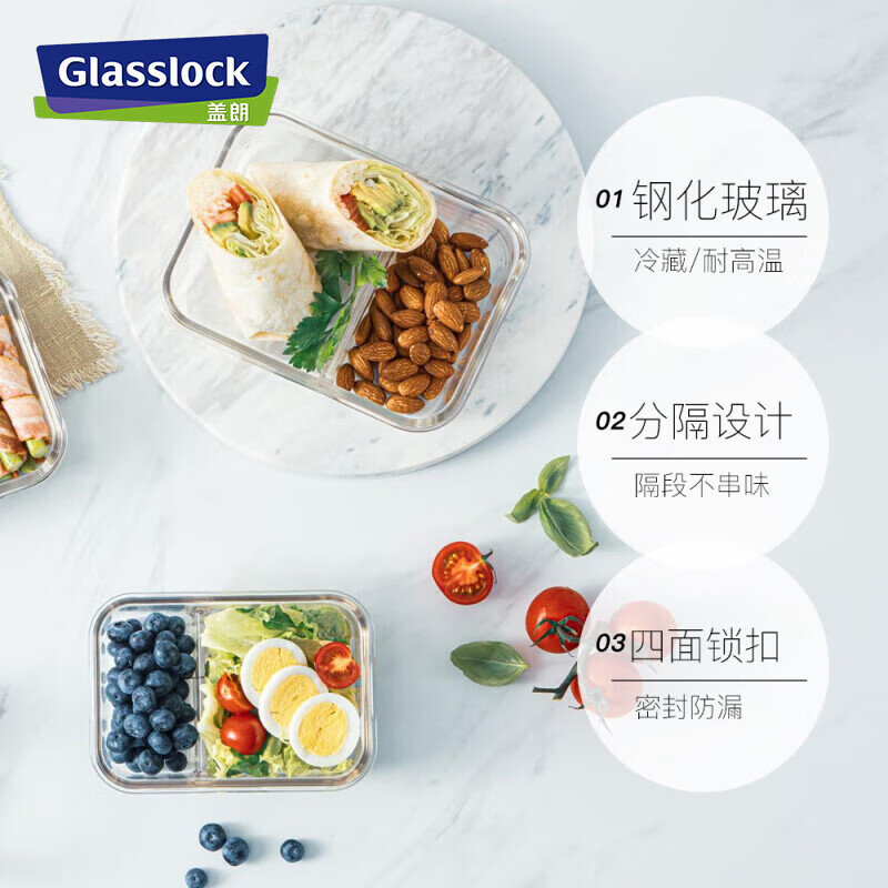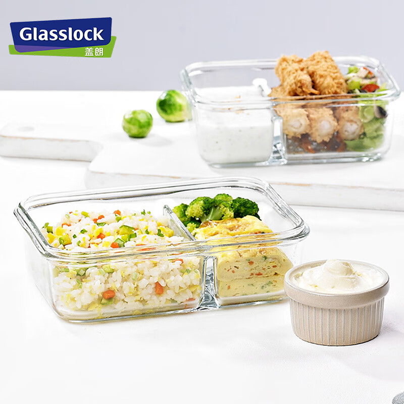 厨具  > 厨房储物  > 保鲜盒  >  GLASSLOCK  >  Glasslock进口钢化玻璃保鲜盒上班带饭微波炉加热分隔食品级饭盒670ml MCRB-067/套