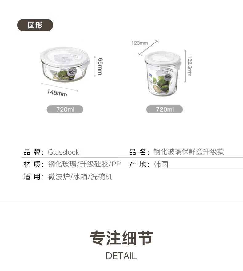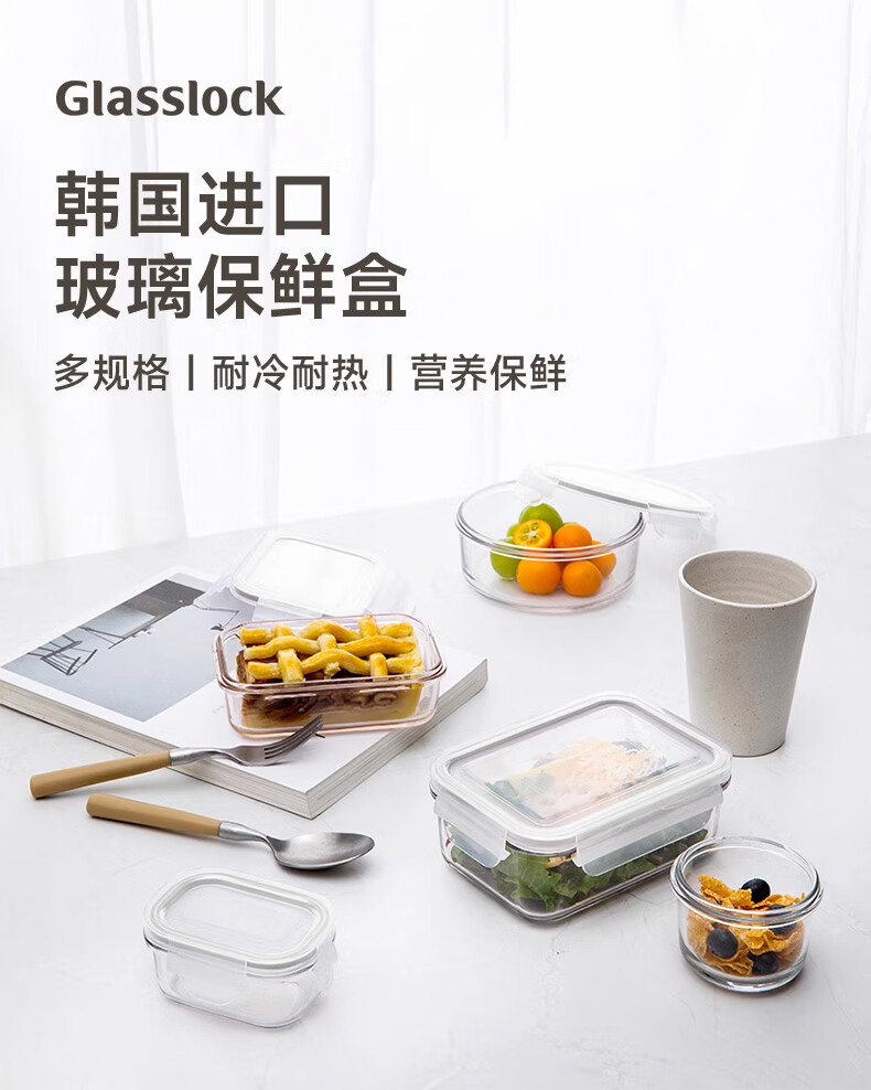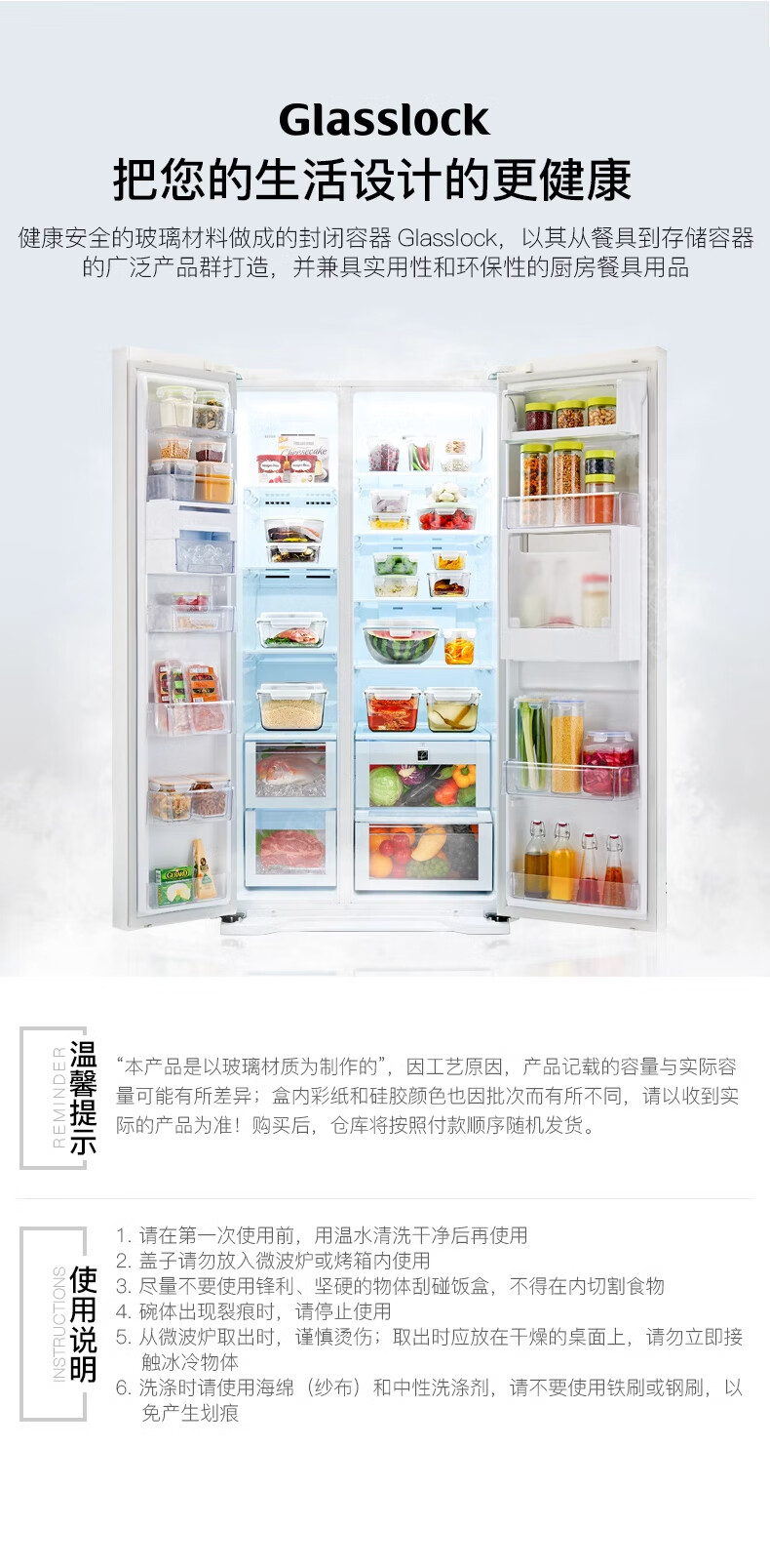 • 商品名称:Glasslock进口钢化玻璃保鲜盒上班族带饭微波炉加热便当盒大容量饭盒1100ml 保鲜盒/套