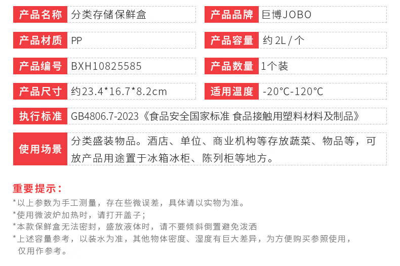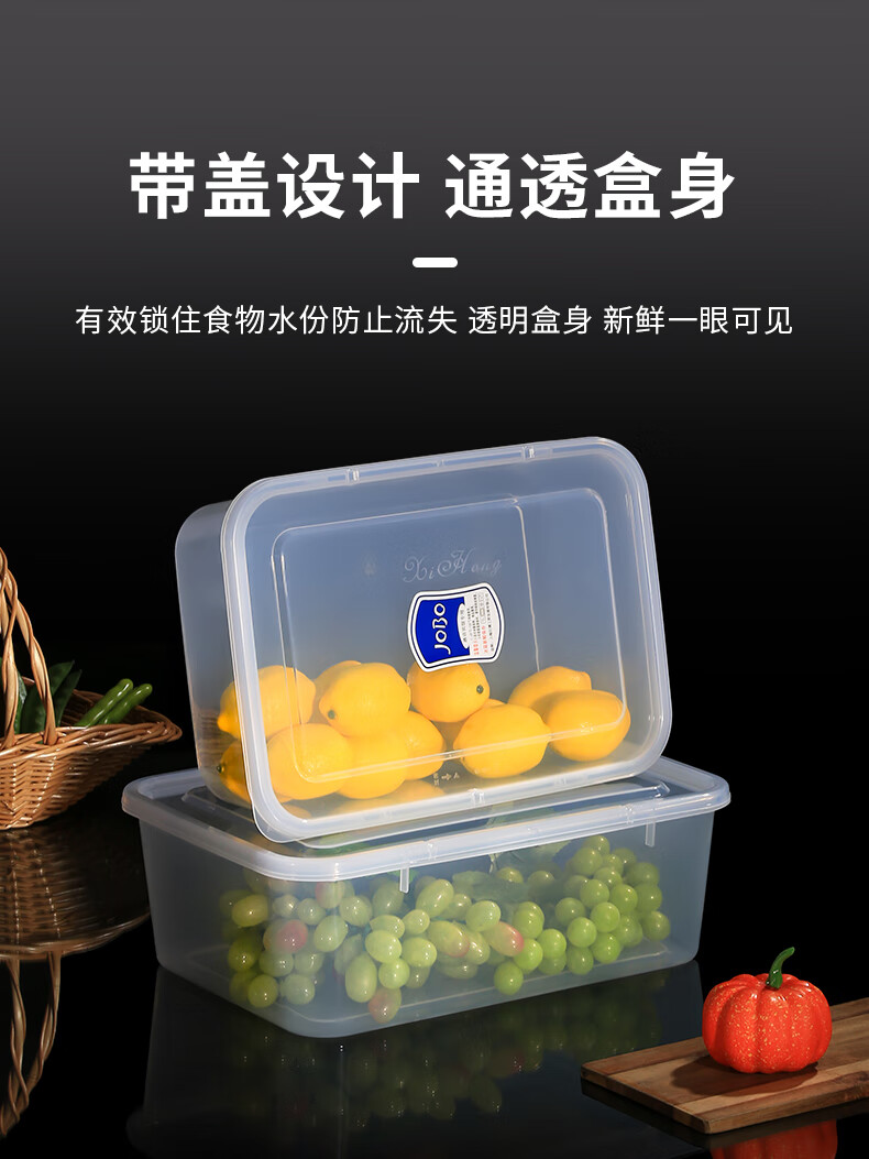 • 商品名称:巨博(JOBO)塑料保鲜盒2L冰箱分类收纳盒蔬菜水果食品储物盒PP食品级 商用保鲜盒/个