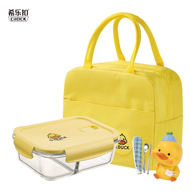厨具  > 厨房储物  > 保鲜盒  >  希乐扣/cilock  >  希乐扣小黄鸭玻璃饭盒上班族带饭可微波炉便当盒大容量保鲜盒 长分隔+包 小黄鸭系列/个