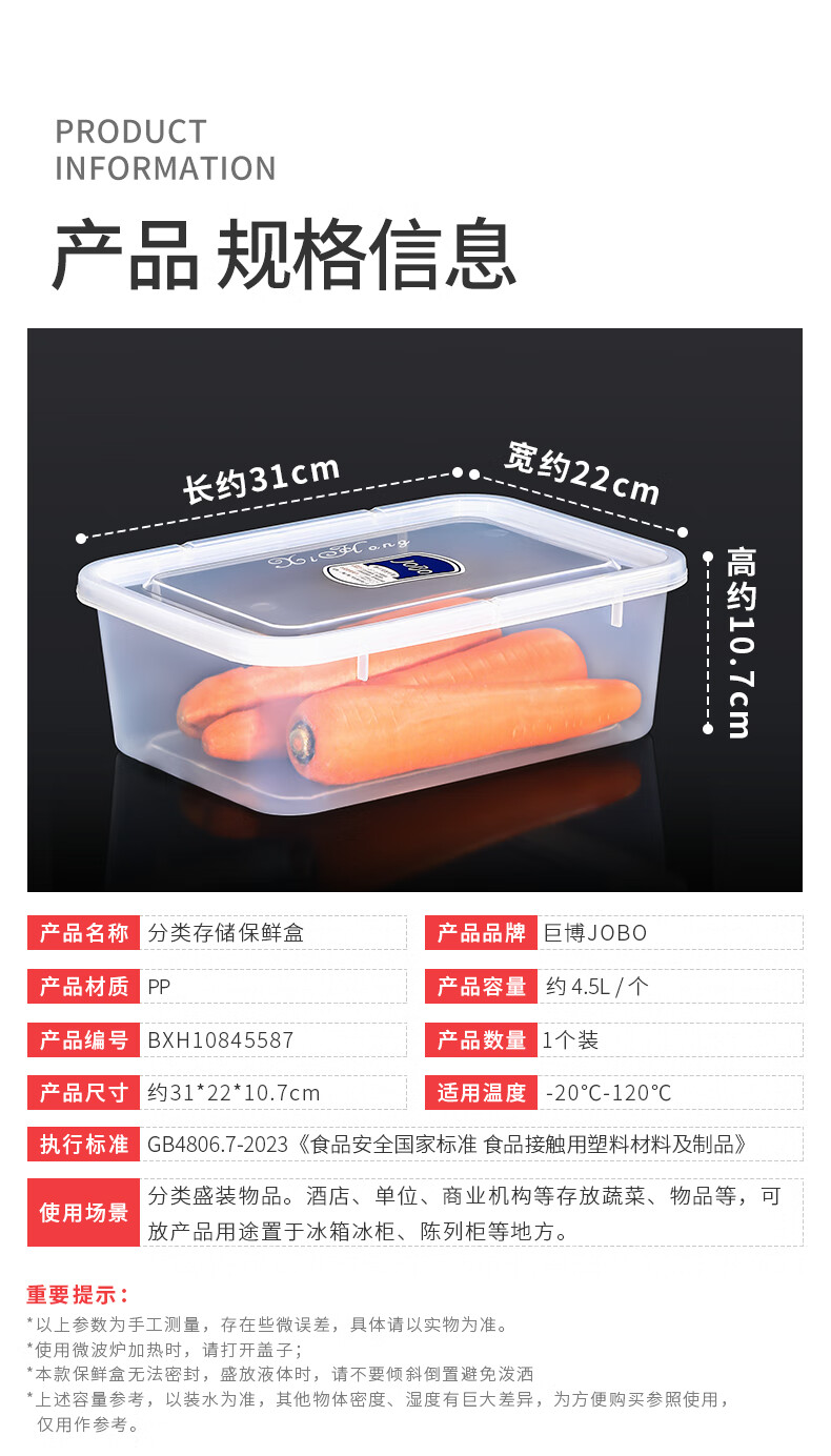 • 商品名称:巨博(JOBO)塑料保鲜盒4.5L冰箱分类收纳盒蔬菜水果食品储物盒PP食品级 商用保鲜盒/个