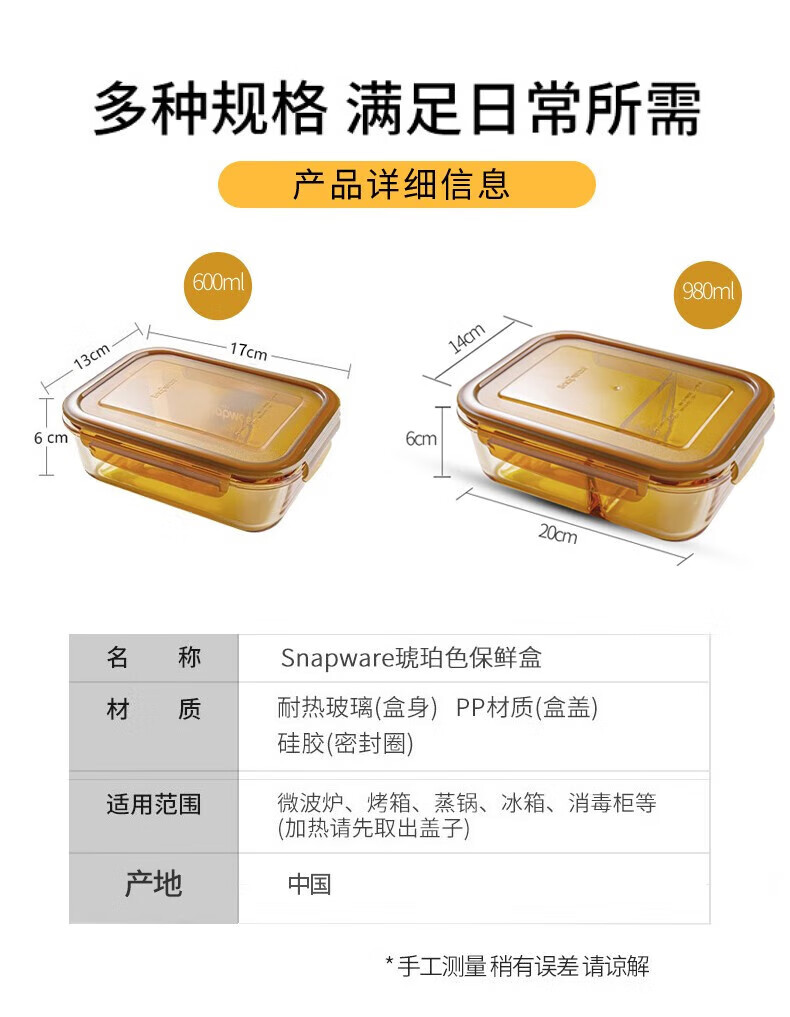 商品名称: Corelle Brands康宁餐具 SNAPWARE琥珀色玻璃保鲜盒耐热玻璃碗微波炉可用700ml SNAPWARE琥珀色保鲜盒700mL圆形/个