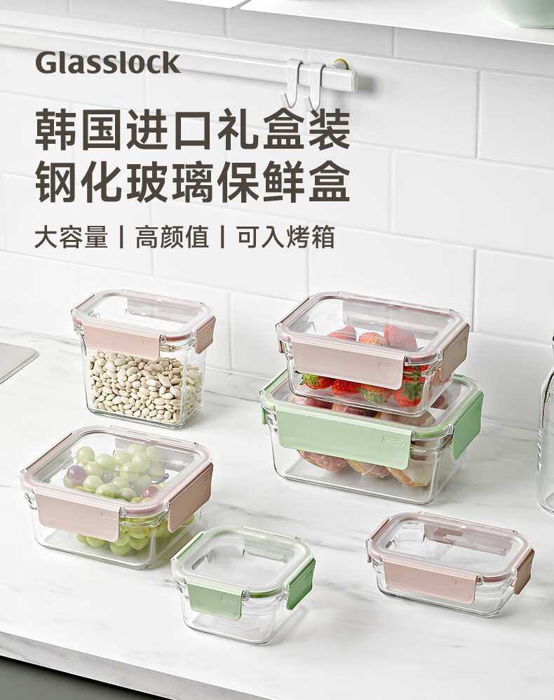 厨具  > 厨房储物  > 保鲜盒  >  GLASSLOCK  >  Glasslock钢化玻璃保鲜耐热适用上班族学生饭盒密封储物保鲜便当盒 礼盒装 GL2920/套
